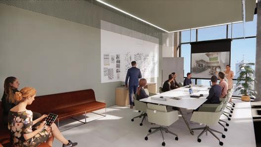 The client presentation room is located of the building with two exterior curtain natural light. There is conference seating banquette seating to accommodate is tech-ready and has pin-up and drawing
