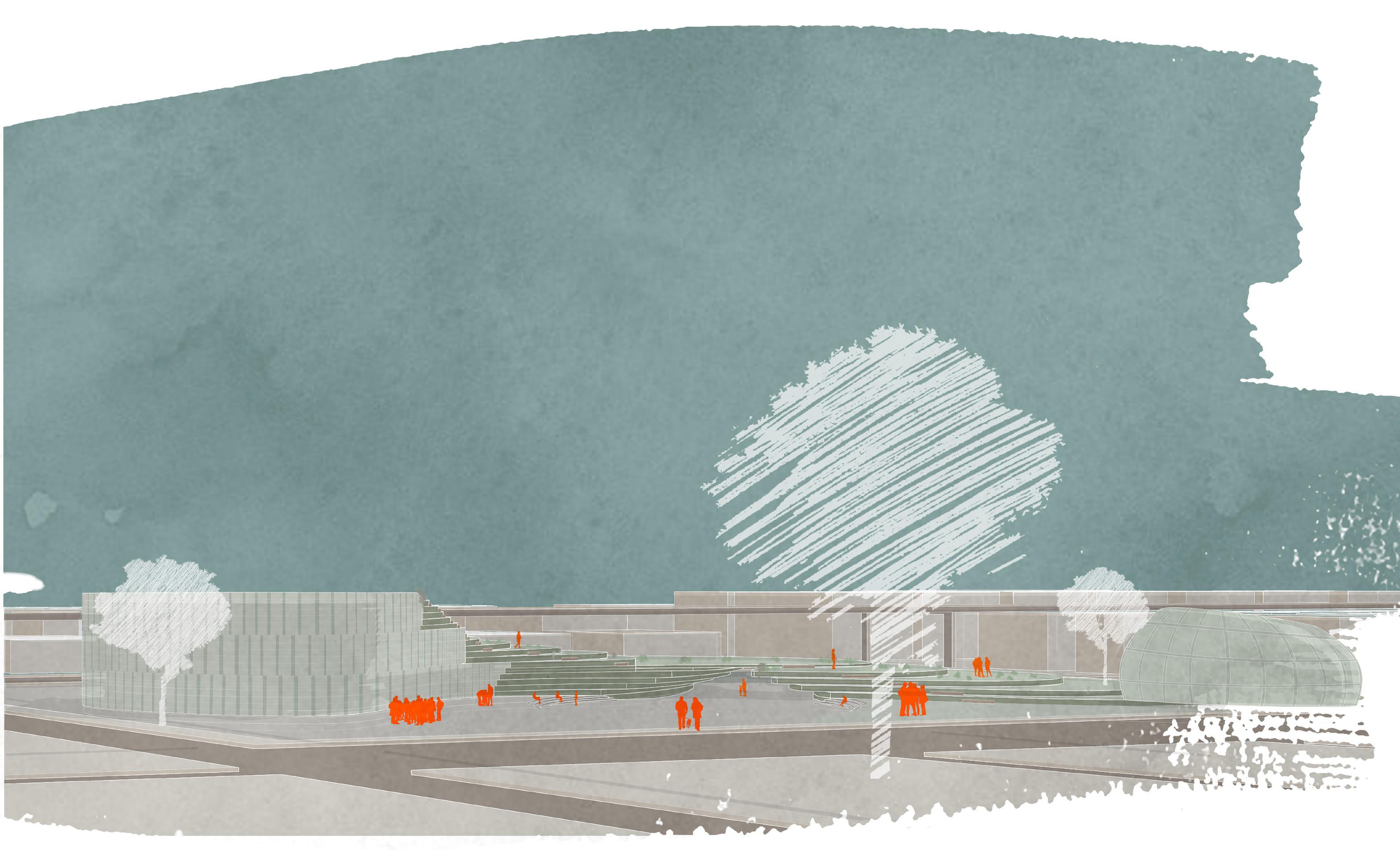 This perspective shows the exterior facade of the building in combination with the terraced landscape and the greenhouse. Also in view is the slight manipulation of the landscape in order to establish the corner to corner connection.