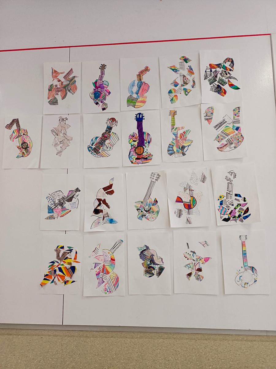 A 4t, estan treballant les obres d’art del famós pintor Pablo Picasso. Inspirant-se en un dels seus quadres, van dibuixar una guitarra i després la van haver de tallar i enganxar de formes diferents, seguint el model Cubista. Són uns artistes!