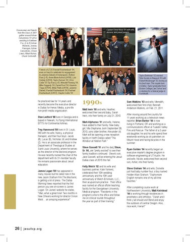 1990s Matt Irwin ’90 and wife, Heather, welcomed their second baby, Sarah Irwin, into their family on July 21, 2010. Mark Alphonso ’91 and wife, Helene, have added to their family. New baby girl, Mia Stephanie, born September 28, 2010, joins older brother, Alexander (4). Mark will be opening a new reception facility in North Dallas called “The Windsor at Hebron Park.” Steve Gossett ’91 and his dad, Steve, Sr. ’66, are “pretty excited” to see their family tradition continued. Steve’s son, Jake Gossett, will be entering the Jesuit Dallas class of 2015 this fall. Kelly Welch ’92 and his wife and business partner, Kate Yonkers, celebrated their 10th wedding anniversary and the 10th year anniversary of Welch &Yonkers, LLC., their acupuncture practice. Their office was named an official offsite teaching facility for the Georgetown University Medical program. “Residents in the program come to the office and follow me on clinical rounds throughout the year as part of their training.”