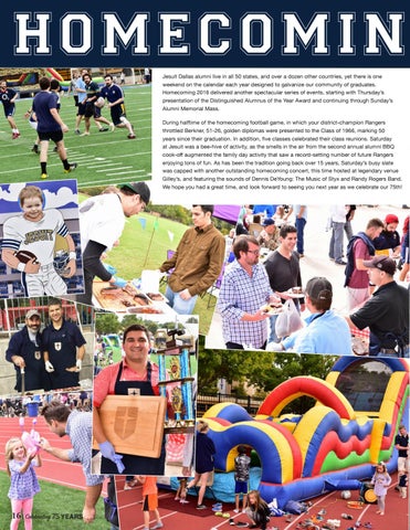 HOMECOMIN Jesuit Dallas alumni live in all 50 states, and over a dozen other countries, yet there is one weekend on the calendar each year designed to galvanize our community of graduates. Homecoming 2016 delivered another spectacular series of events, starting with Thursday’s presentation of the Distinguished Alumnus of the Year Award and continuing through Sunday’s Alumni Memorial Mass. During halftime of the homecoming football game, in which your district-champion Rangers throttled Berkner, 51-26, golden diplomas were presented to the Class of 1966, marking 50 years since their graduation. In addition, five classes celebrated their class reunions. Saturday at Jesuit was a bee-hive of activity, as the smells in the air from the second annual alumni BBQ cook-off augmented the family day activity that saw a record-setting number of future Rangers enjoying tons of fun. As has been the tradition going back over 15 years, Saturday’s busy slate was capped with another outstanding homecoming concert, this time hosted at legendary venue Gilley’s, and featuring the sounds of Dennis DeYoung: The Music of Styx and Randy Rogers Band. We hope you had a great time, and look forward to seeing you next year as we celebrate our 75th!