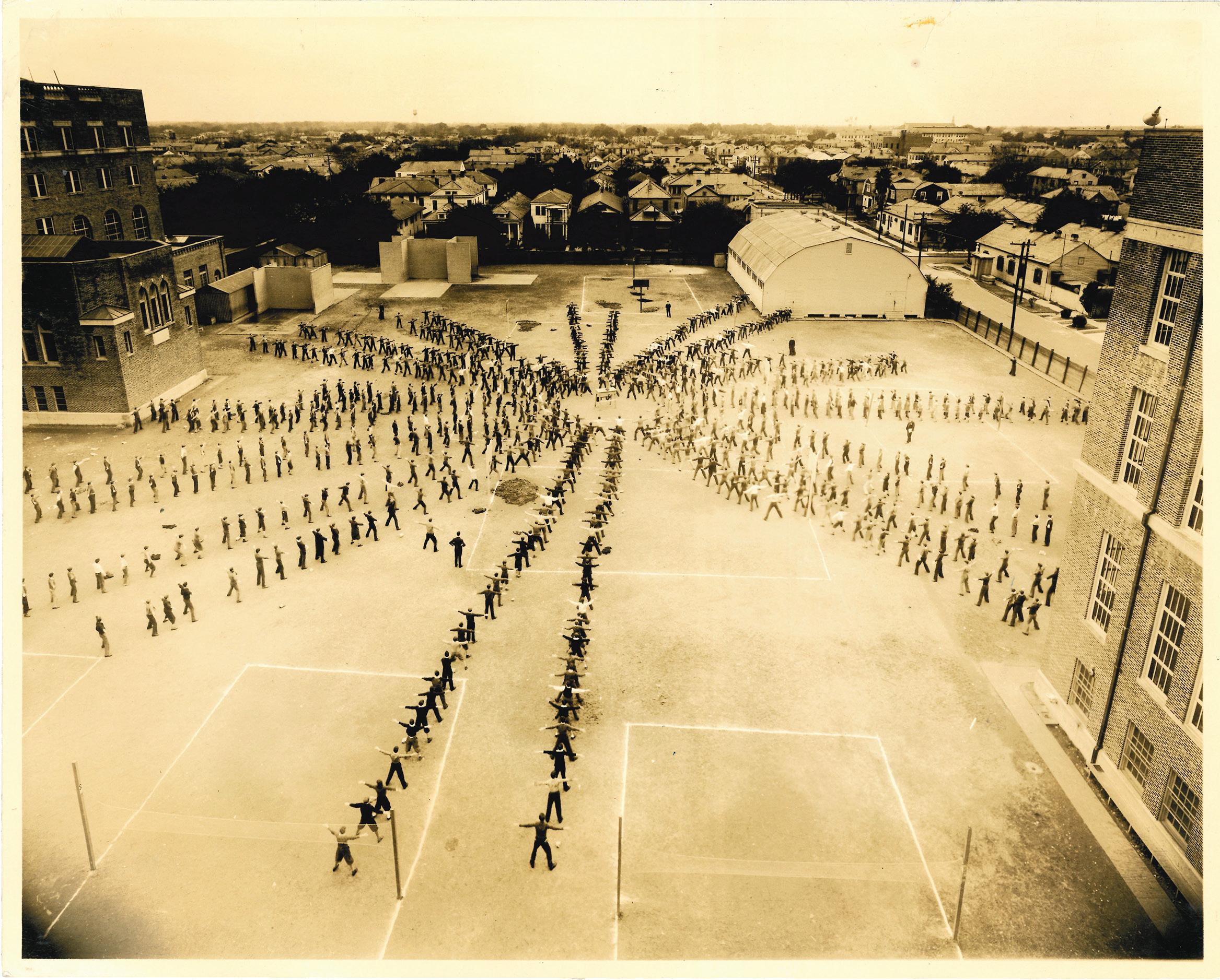 FROM THE ARCHIVES: This photograph, estimated to be from the 1930s, showcases the entire student body engaged in calisthenics in what was once a spacious yard. The image captures a moment of camaraderie and physical activity, reflecting the school's long-standing traditions.
