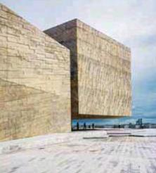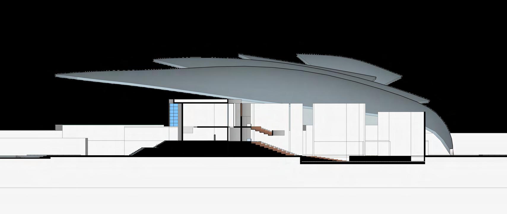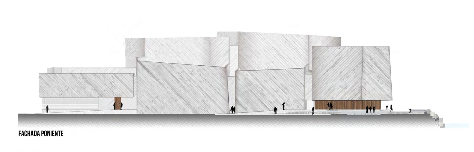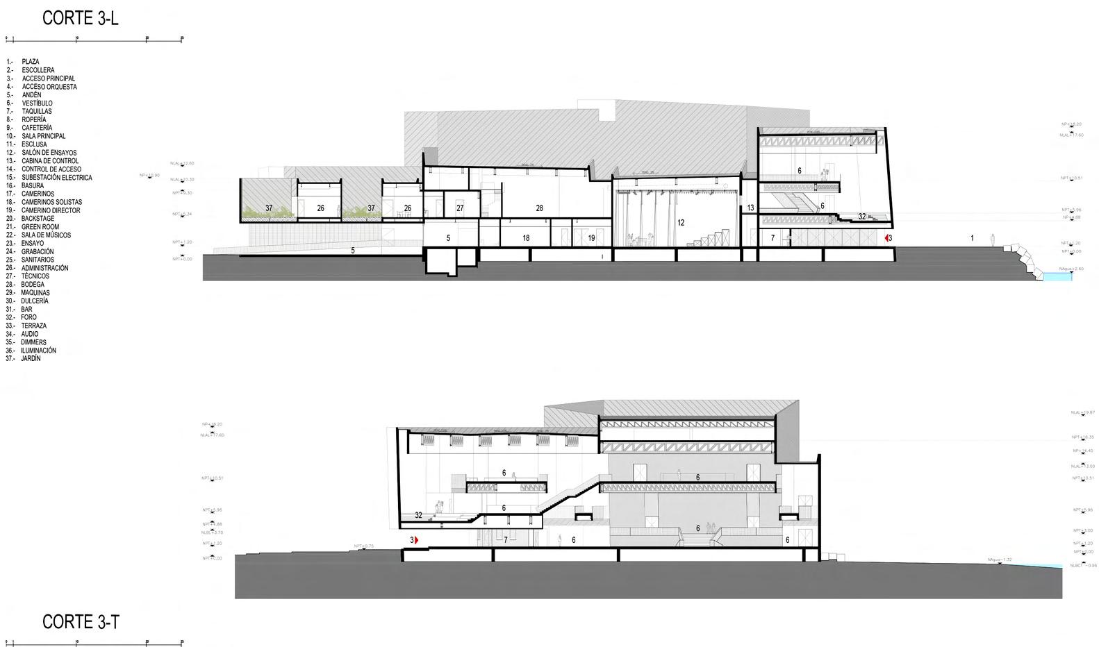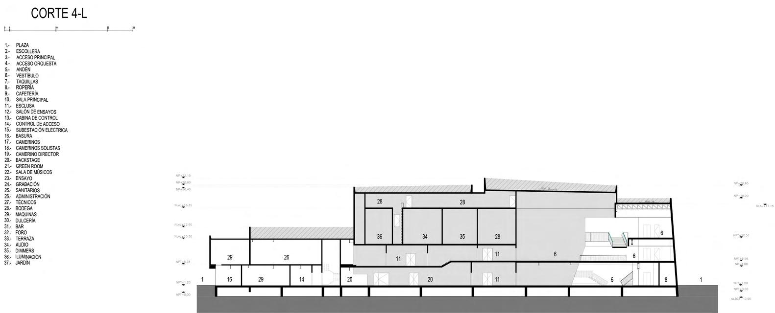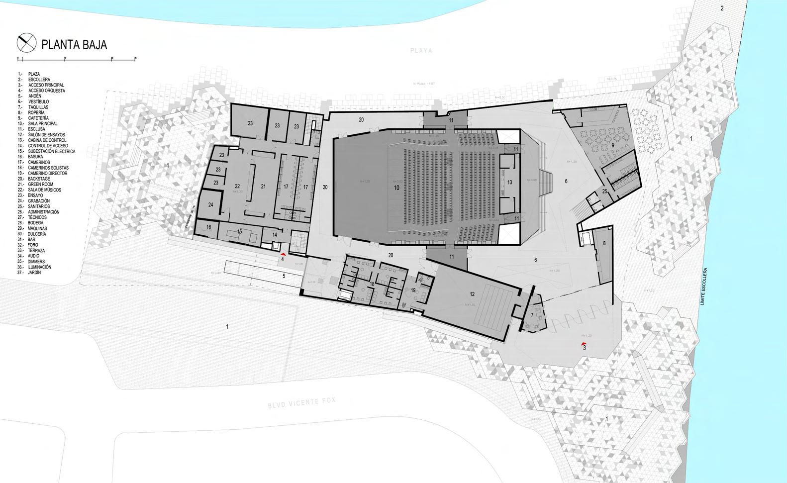 El edificio retoma la expresión atemporal de los cubos de concreto que forman las escolleras, las asimila como su origenylasreinterpretaenun edificio de concreto aparente, formado por diversos volúmenes que se organizan en forma aleatoria para contener a la sala de conciertos.