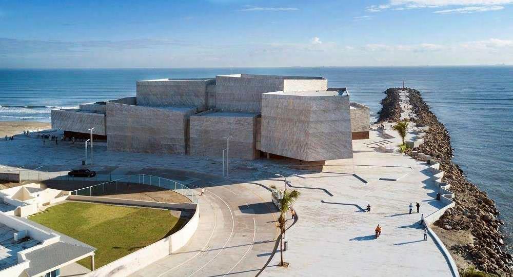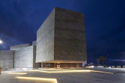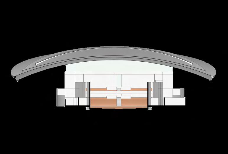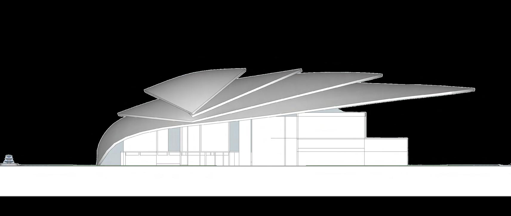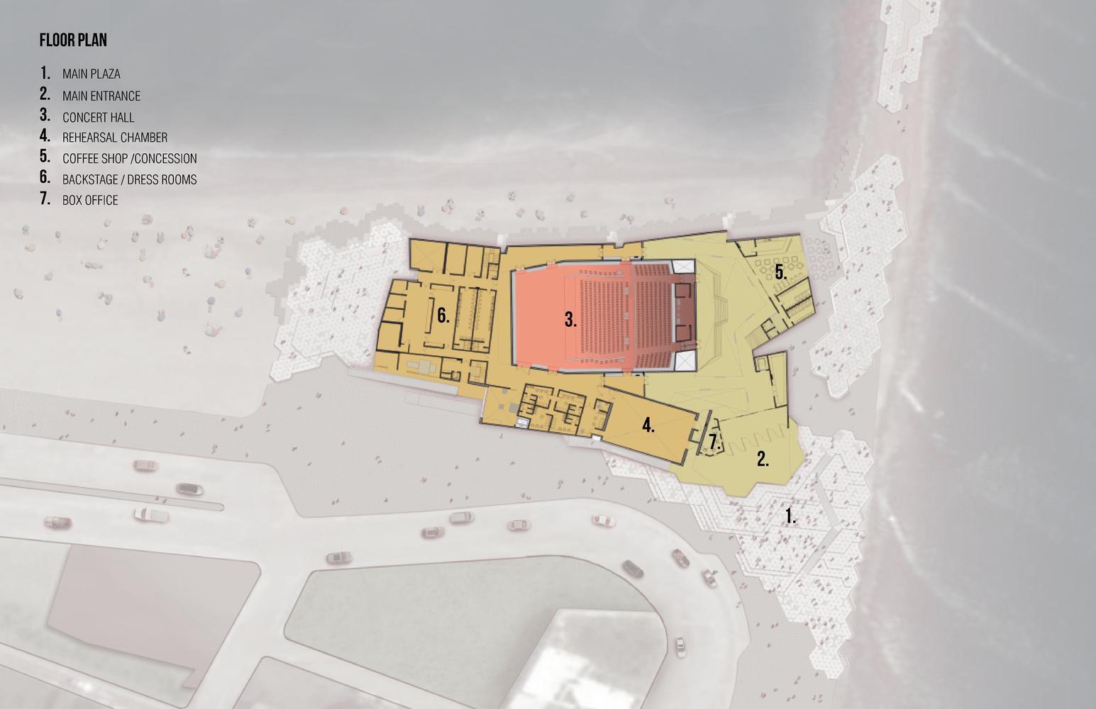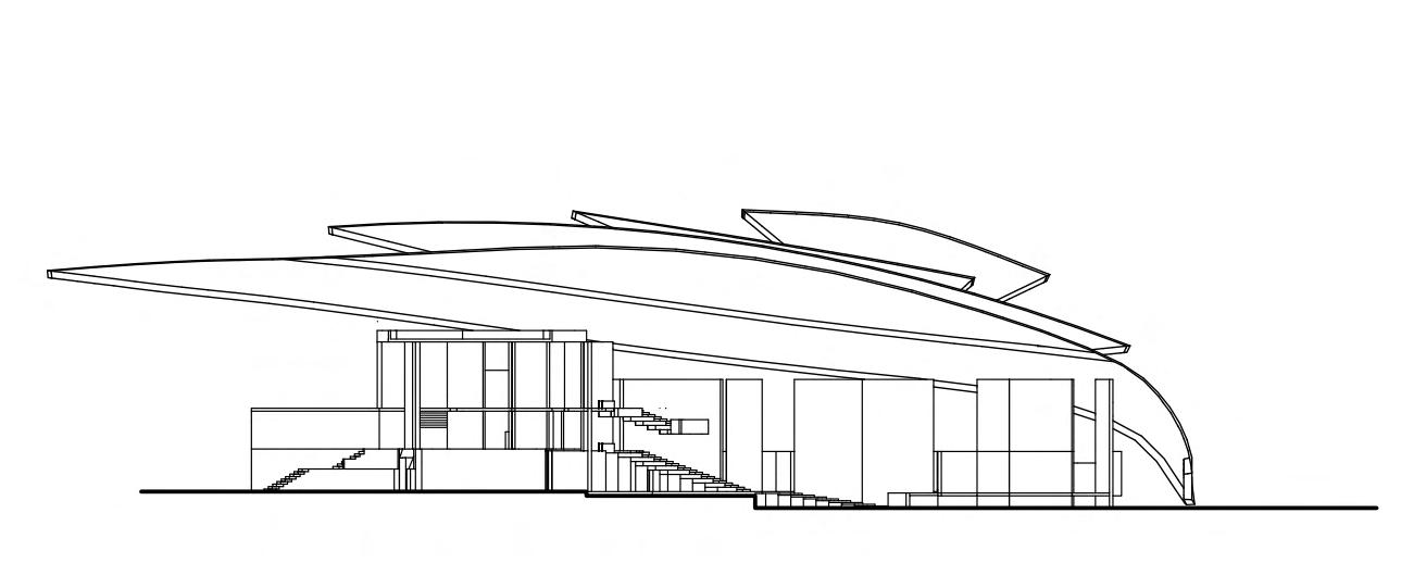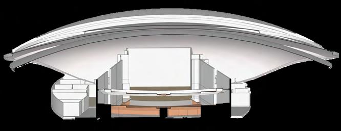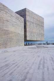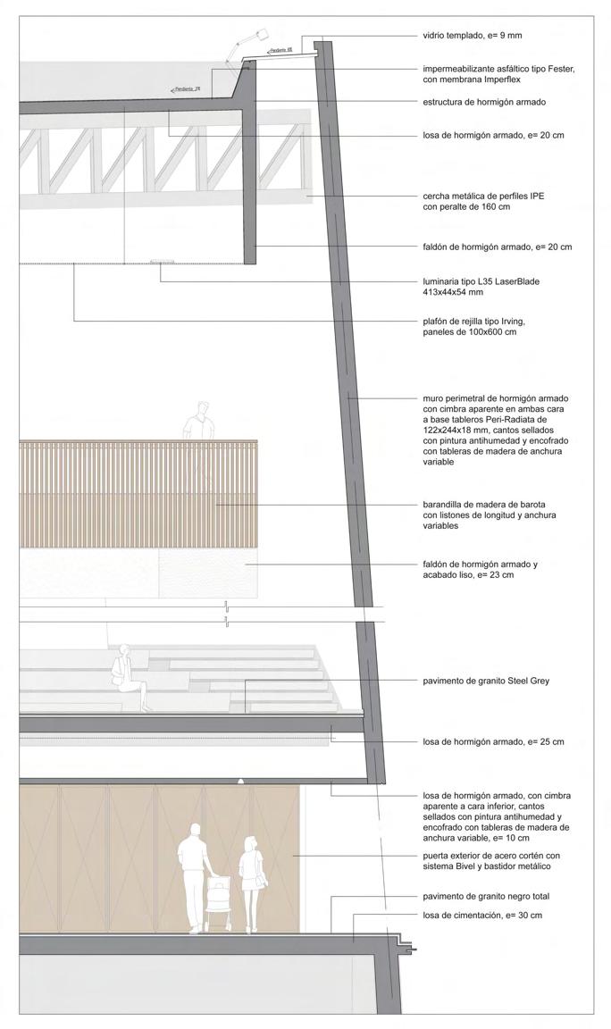 El edificio retoma la expresión atemporal de los cubos de concreto que forman las escolleras, las asimila como su origenylasreinterpretaenun edificio de concreto aparente, formado por diversos volúmenes que se organizan en forma aleatoria para contener a la sala de conciertos.