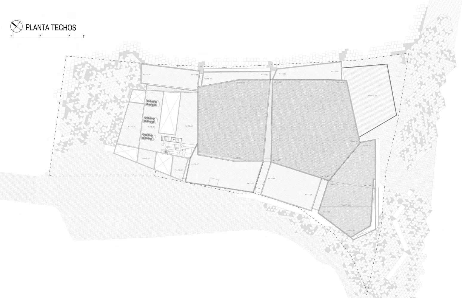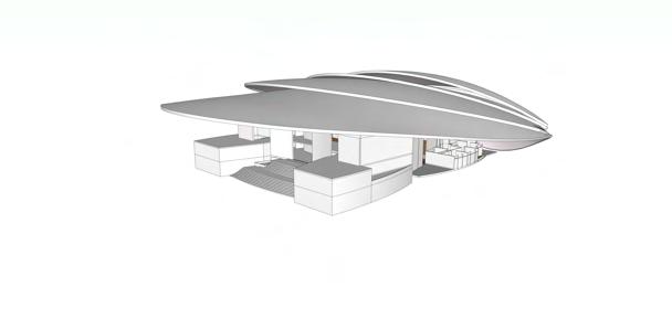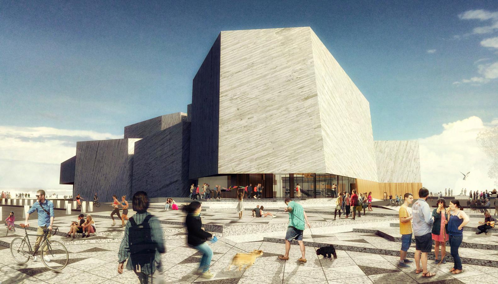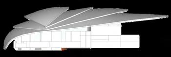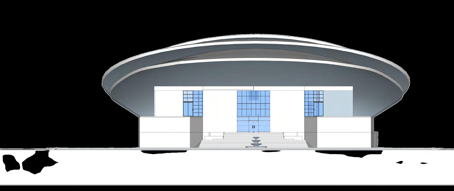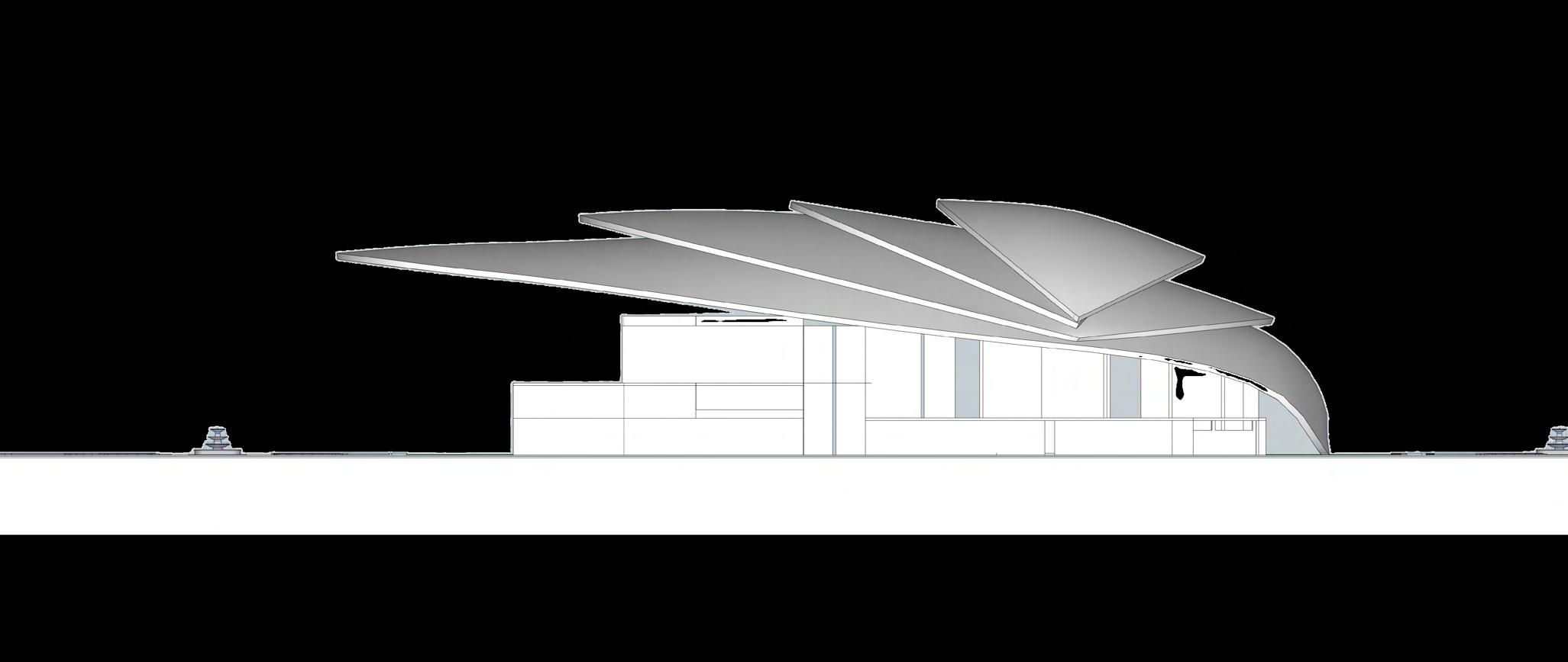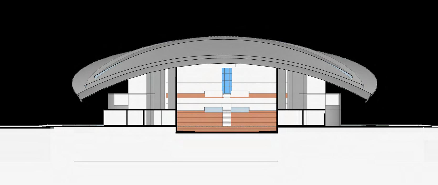 El edificio retoma la expresión atemporal de los cubos de concreto que forman las escolleras, las asimila como su origenylasreinterpretaenun edificio de concreto aparente, formado por diversos volúmenes que se organizan en forma aleatoria para contener a la sala de conciertos.