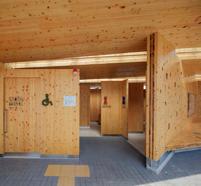 El tratamiento exterior del volumendejavistoelhormigóny eldespiecedesuencofrado.Los listonesquelohanconformado siguen ángulos de inclinación diferente en cada una de sus caras. Además, cada listón presenta una posición relativa diferenteconrespectoalplano de fachada, sobresaliendo o retranqueándoseconrespectoa losadyacentes.