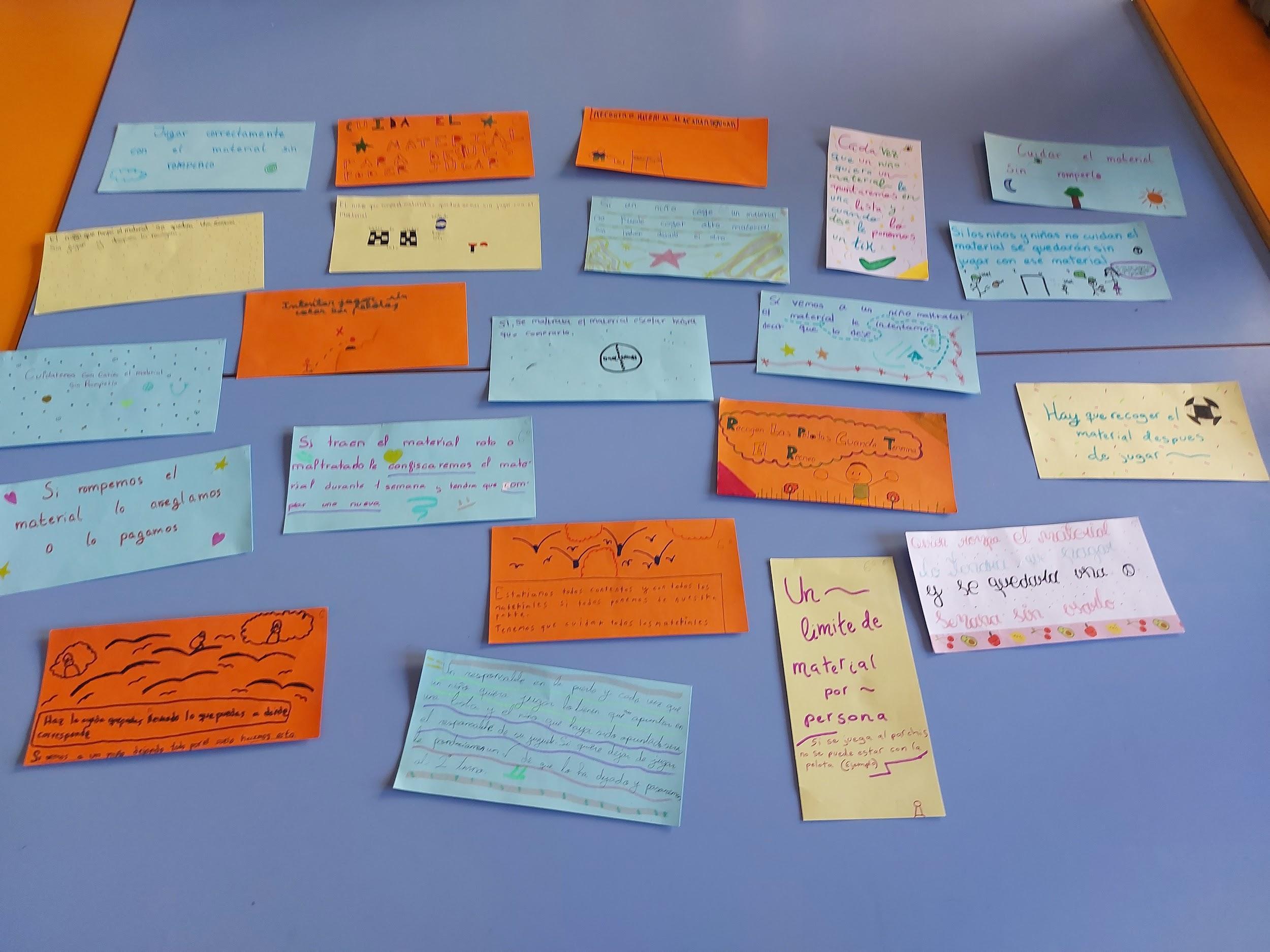 A continuación, por grupos, fueron elaborando normas que creían que había que tener para mejorar esta situación. Después, se fue haciendo una selección con las que les parecían mejor, de forma consensuada.LLegaron a la conclusión, que entre todos hay que cuidar y respertar el material , porque es un bien común para los niños y las niñas del colegio.