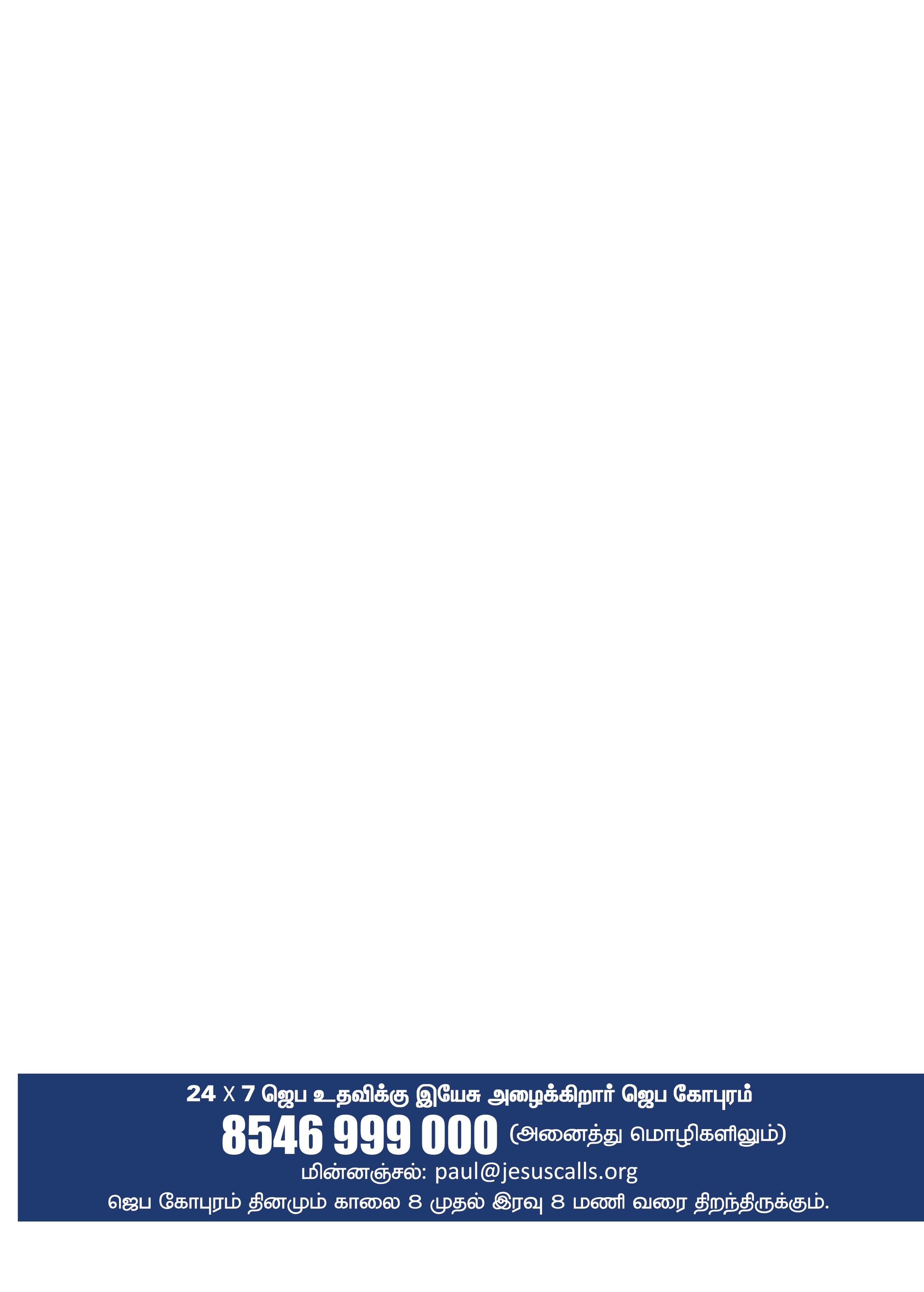 c§fŸ å£il¥ ghJfh¥gj‰fhd b#g¤â‰F gâš bg‰nwhuhf, thœ¡if Jizahf, ghJfhtyuhf MÓ®thj¤â‹ Rjªju¤ij bg‰W¡bfhŸs thŒ¥ò. Ú§fŸ gâî brŒí«nghJ, âdrÇ b#g«: c§fŸ FL«g¤â‰fhf mDâdK« b#g« VbwL¡f¥gL« âUkz ehŸ MÓ®thj«: c§fŸ âUkz ehË‹nghJ bjhiyngá _y« ÉnrΤj miH¥ò th¡F¤j¤j rh‹¿jœ: c§fŸ e‹bfhil %.5,000 milí«nghJ njt trd« ml§»a rh‹¿jiH bgWå®fŸ. ï‹nw c§fŸ FL«g¤ij ïiz¤âL§fŸ; c§fŸ m‰òj¤â‰FŸ mobaL¤J ití§fŸ b#g ghJfh¥ò ïšyhkš xU ehisí« fl¡fnt©lh«. c§fŸ khjhªâu bghU¤jidia bjǪbjL§fŸ; nghuh£l§fis rh£áahf kh‰W§fŸ. khjªnjhW« %.300/- khjªnjhW« %.500/- khjªnjhW« %.1,000/- khjªnjhW« %.5,000/nkY« Étu§fis m¿aî«, gâî brŒaî« www.jesuscalls.org/donate/fbp v‹w ïiza g¡f¤ij ghU§fŸ bjhiyngá: 044 23456677 (fhiy 8 Kjš ïuî 8 k tiu k£L«) ï¥nghnj ïizªâL§fŸ; c§fŸ j¤jË¥òfis njt‹ bgÇa bt‰¿ahf kh‰Wtij fhQ§fŸ c§fŸ fh¡iffis vËjhd tÊfËš mD¥ò« tÊKiwfis ïªj ïjÊ‹ 19« g¡f¤âš fhQ§fŸ.