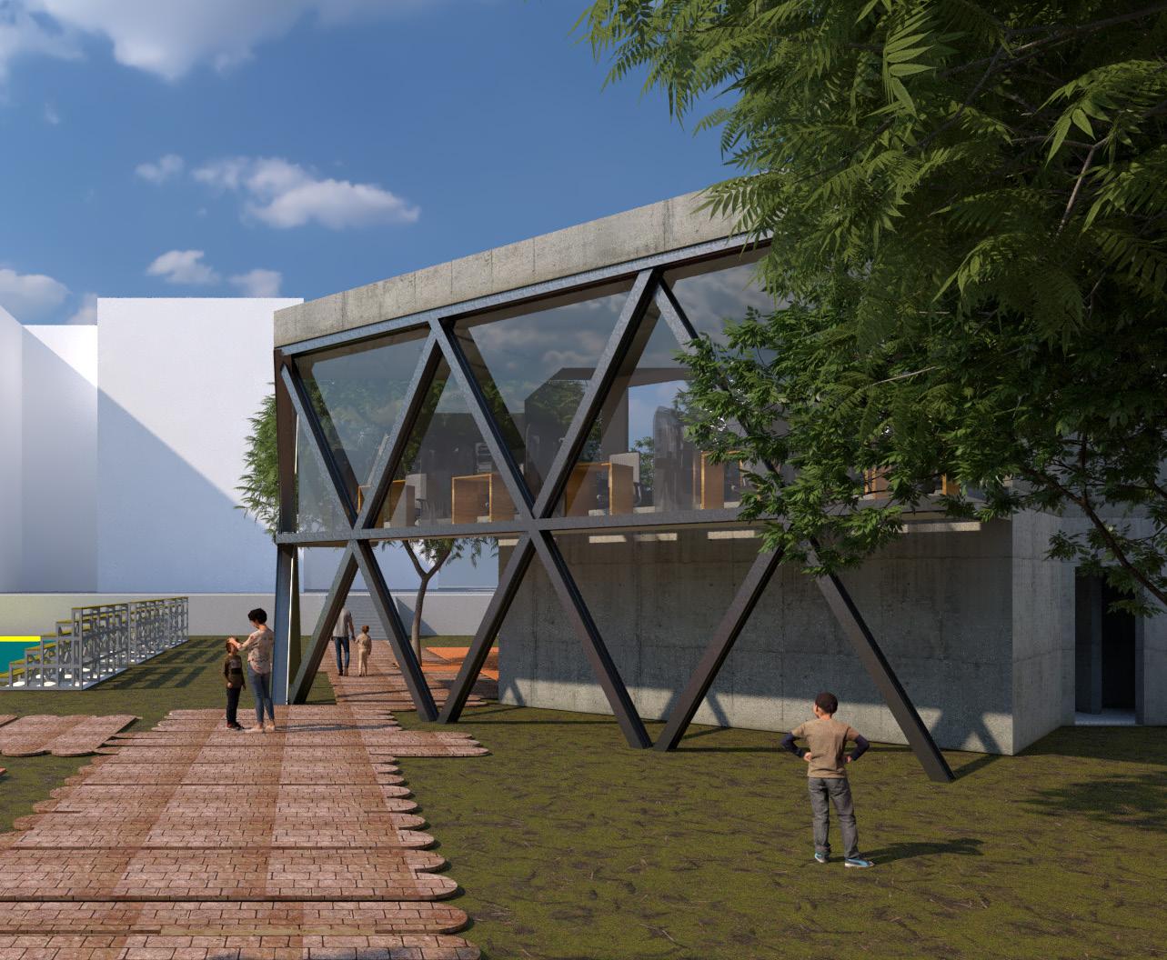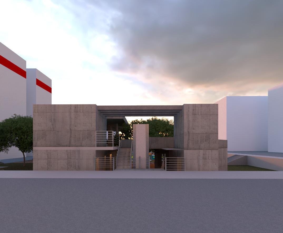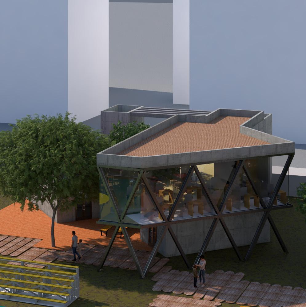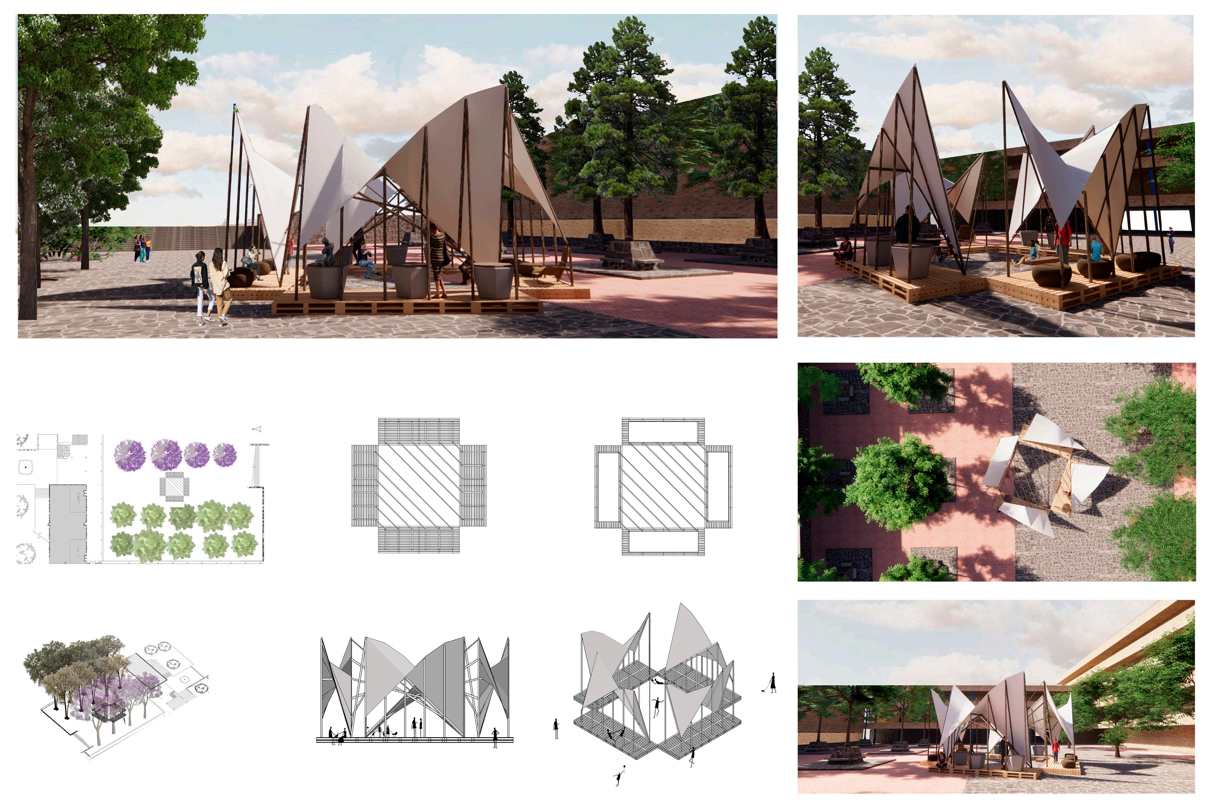 Ganador dentro del Nivel en el Taller “Carlos Lazo” de la Facultad de Arquitectura de la UNAM. Se propone un pabellón que define espacios virtuales, para que el estudiantado pueda hallar en él, un espacio de reunión.