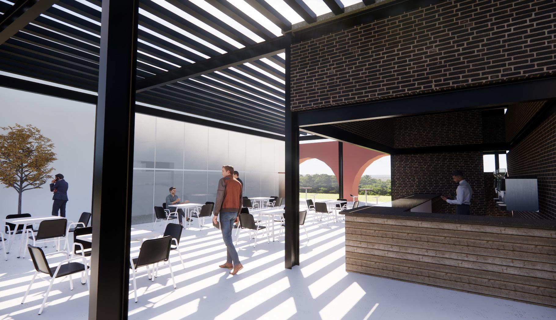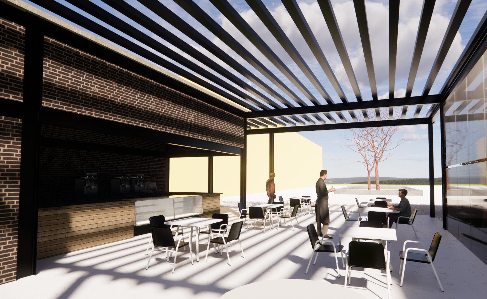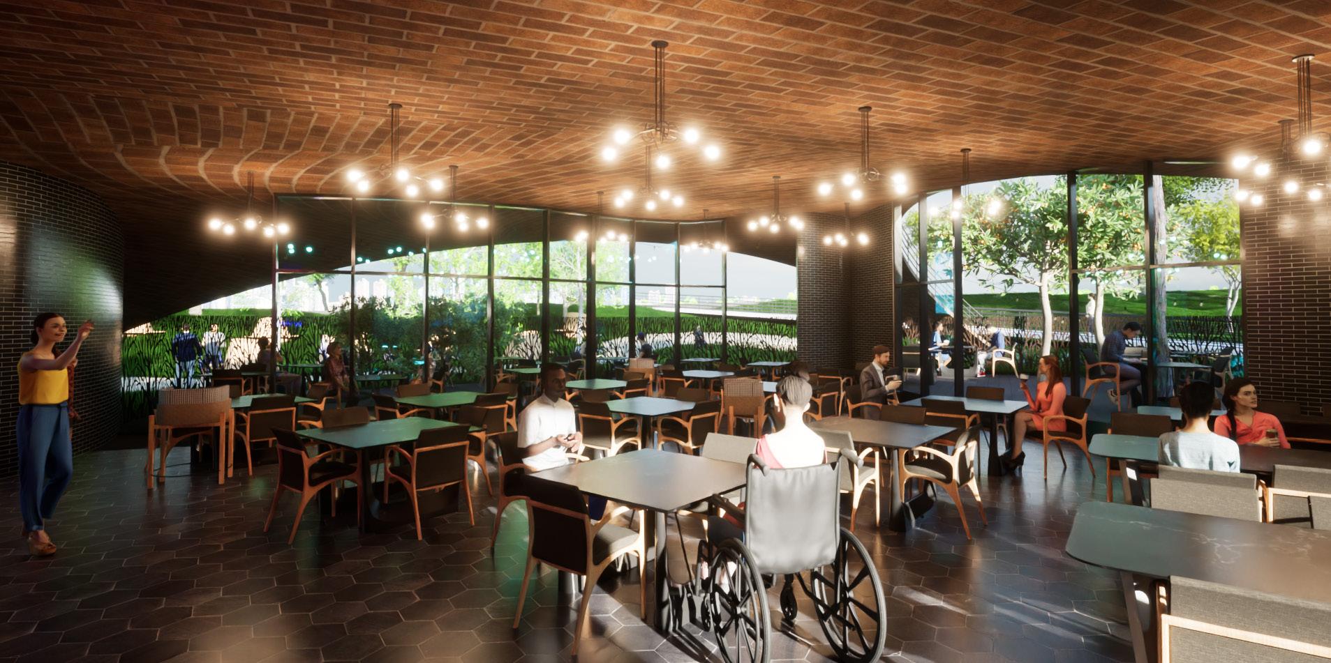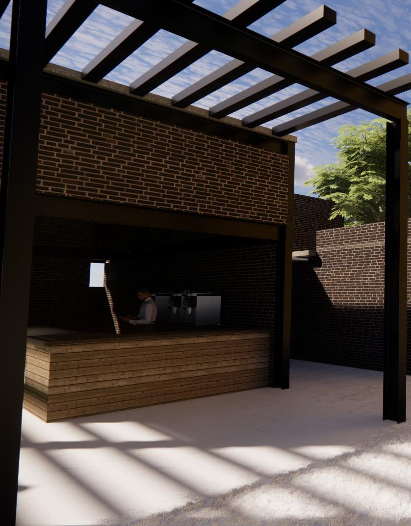 Cafetería con locales comerciales, dentro de un conjunto cultural.
