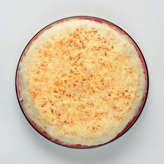 Cuécela por el otro lado y colócala en una bandeja redonda apta para el horno.Cúbrelaenteraconbechamelydispónelquesoralladoporencima.