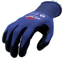From left to right, the grey palmed glove has Polyurethane coating with a ‘second-skin’ feel. It‘s incredibly dexterous, designed for precision handling tasks in high-risk environments where cut hazards are present. It has extra reinforcement between thumb and forefinger for added protection in that very vulnerable area of the hand.