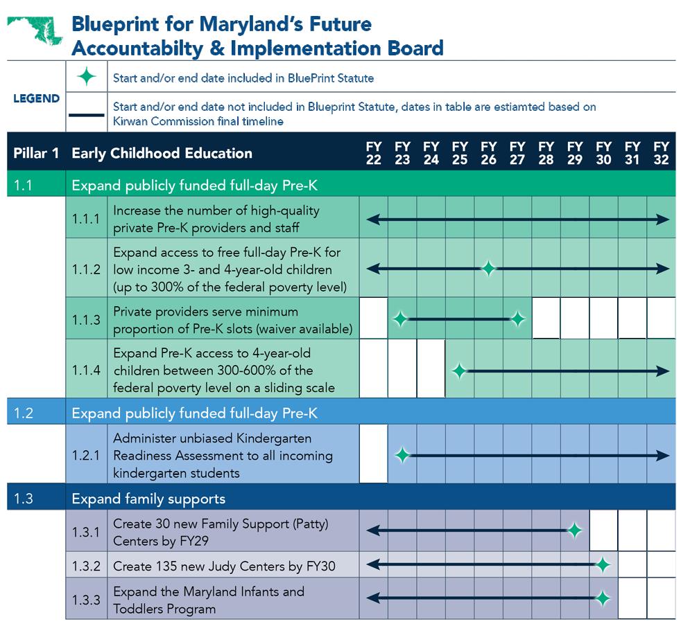 74. Accountability and Implementation Board. 2022. Blueprint for Maryland’s Future. AIB Blueprint Pillar 1: Early Childhood Education Implementation Goals and Timeline. (2022-2033) retrieved from https://aib.maryland.gov/Pages/1earlyeducation.aspx