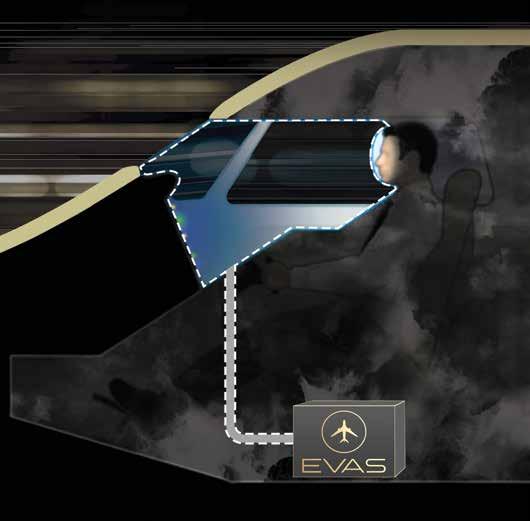 corporate fleets and private jets. The EVAS safety system displaces smoke from the flight crew’s line of sight to their critical flight instruments and the windscreen, and replaces it with clear, filtered air via a bespoke Inflatable Vision Unit.