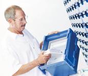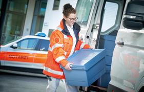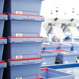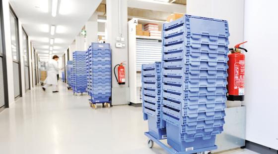 The hospital pharmacy required robust containers, as high circulation rates are achieved on a daily basis. The sensitive and expensive products were to be protected from unauthorised access, and the cold chain was not to be interrupted for items requiring refrigeration. As space was limited, the customer asked for volume-saving (nestable) containers, which also had to have good traveling properties on conveyor belts.