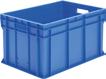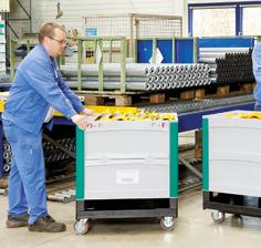 BITO Heavy-duty SL containers sized 800 x 600 mm with runners and half-drop door SLs are used as distribution container in the supplier/ production plant cycle, in the buf fer store and along assembly lines