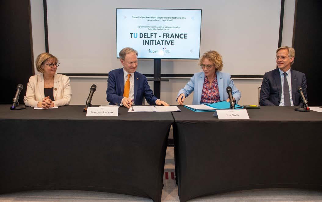 Het convenant is door Ena Voûte (TU Delft) en François Alabrune (Franse ambassadeur in Nederland) ondertekend in het bijzijn van de Franse minister van Onderwijs Sylvie Retailleau en de Nederlandse minister van Onderwijs Robbert Dijkgraaf. Foto door TU Delft.
