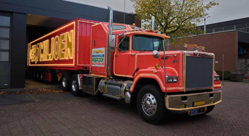 voor het oog in perfecte staat de weg op gaat. “In vol ornaat trekken de zeven door heel Europa, de laatste jaren rijdend op HVO-brandstof”, legt Vaessen uit. Een ander voertuig uit de ‘stal’ van EventRent dat opvalt en in concoursstaat moet stralen, is de Nederlandse decemberklassieker waarmee de Nationale Postcode Loterij de winnaars van de nieuwjaarstrekking verrast. Ook deze combinatie, getrokken door een originele Mack Superliner uit 1987, wordt elk jaar zorgvuldig rijklaar gemaakt. Voor de foto (pagina 10) werd hij onlangs de werkplaats uit gereden, om zonder oplegger vervolgens een testrit naar het tankstation om de hoek te maken. De imposante rode Amerikaan is een aandachttrekker, en net als de kersttrucks is de complete combinatie feestelijk. De oplegger staat symbool voor de huidige hoofdprijs van 59,7 miljoen euro. Vaessen vertelt dat er ongeveer 2800 lampen in de dubbele wand van de oplegger zijn gemonteerd om dat bedrag feestelijk in het licht te zetten.