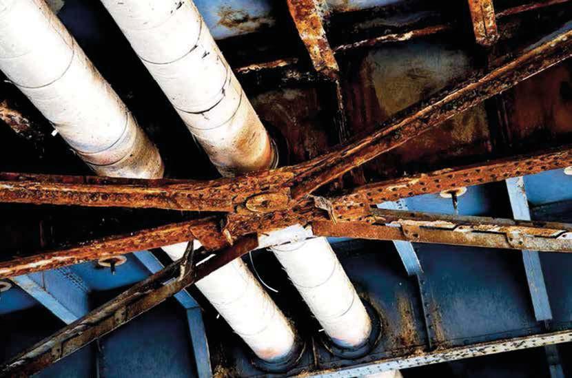 De impact van corrosie is enorm. Traditionele industriële sectoren, waaronder de maritieme en bouwsector, worden zwaar getro en. Schade aan pijpleidingen, bruggen en o shore-installaties leidt tot stilstand, hoge reparatiekosten en in sommige gevallen catastrofale ongeluk- ken. Naast de directe financiële verliezen is er sprake van een indirecte belasting voor de economie, doordat verzwakte structuren leiden tot minder e ciënt energiegebruik en verhoogde onderhoudsbehoeften. In maritieme omgevingen versnellen zout en hoge luchtvochtigheid het corrosieproces. Foto’s van roestige scheepsrompen en beschadigde constructies illustreren de destructieve werking van deze natuurlijke vijand. Om de veiligheid en betrouwbaarheid van kritieke infrastructuren te garanderen, is het dus essentieel om nieuwe beschermingsstrategieën te ontwikkelen.