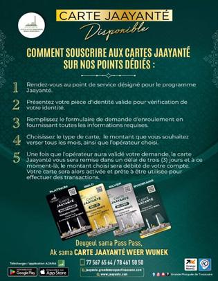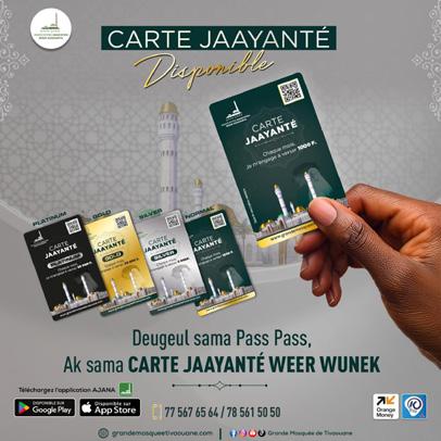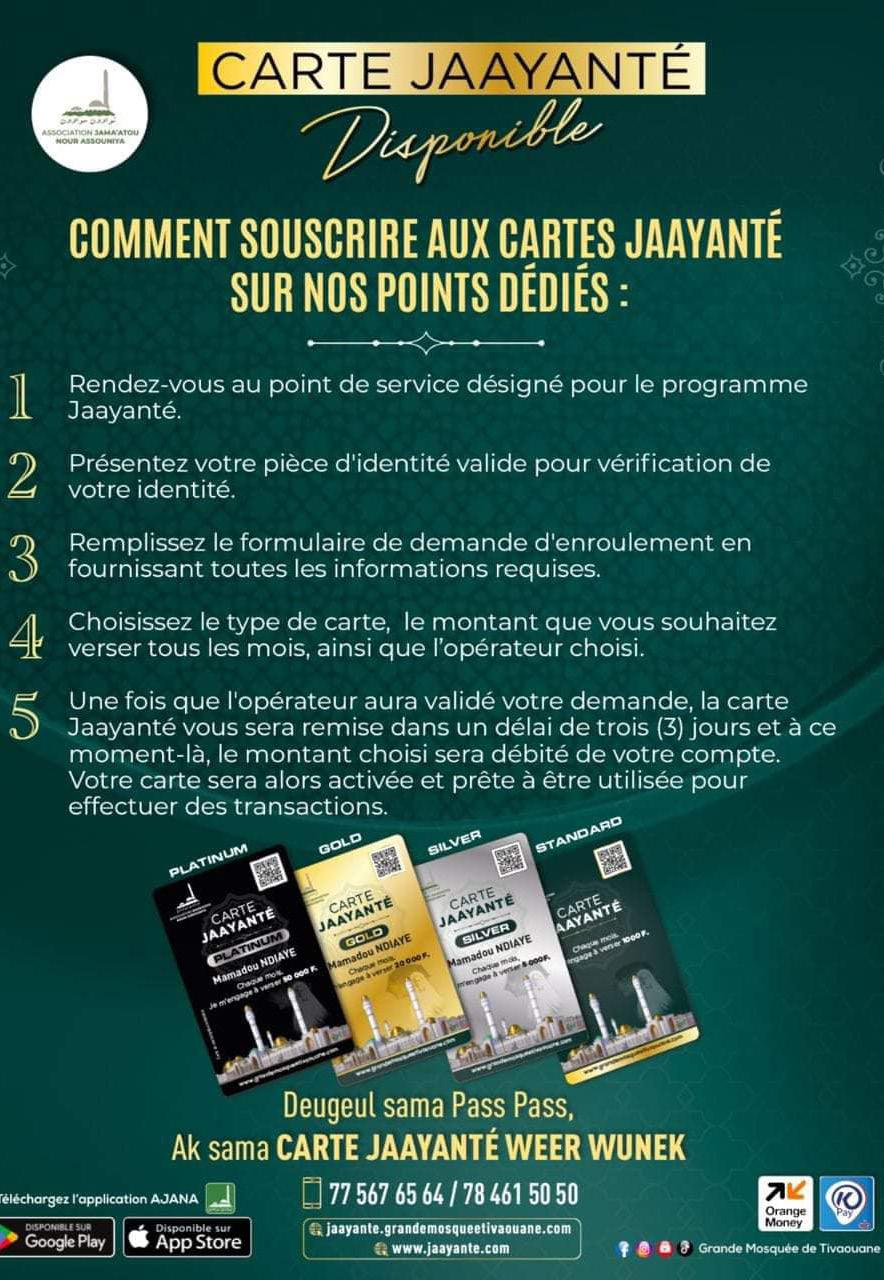 L’association JAMA’ATOU NOUR ASSOUNIYA en charge de la coordination des travaux de la grande mosquée de Tivaouane, fidèle à se démarche innovante et pragmatique, a lancé une nouveauté salutaire dans la campagne de financement des travaux de la grande mosquée. Après les pins et les levés de fonds, les CARTES JAAYANTE viennent renchérir cette nouvelle dynamique Tidiane de participation volontaire. Le lien de la plateforme dédiée : jaayante. grandemosqueetivaouane.com/