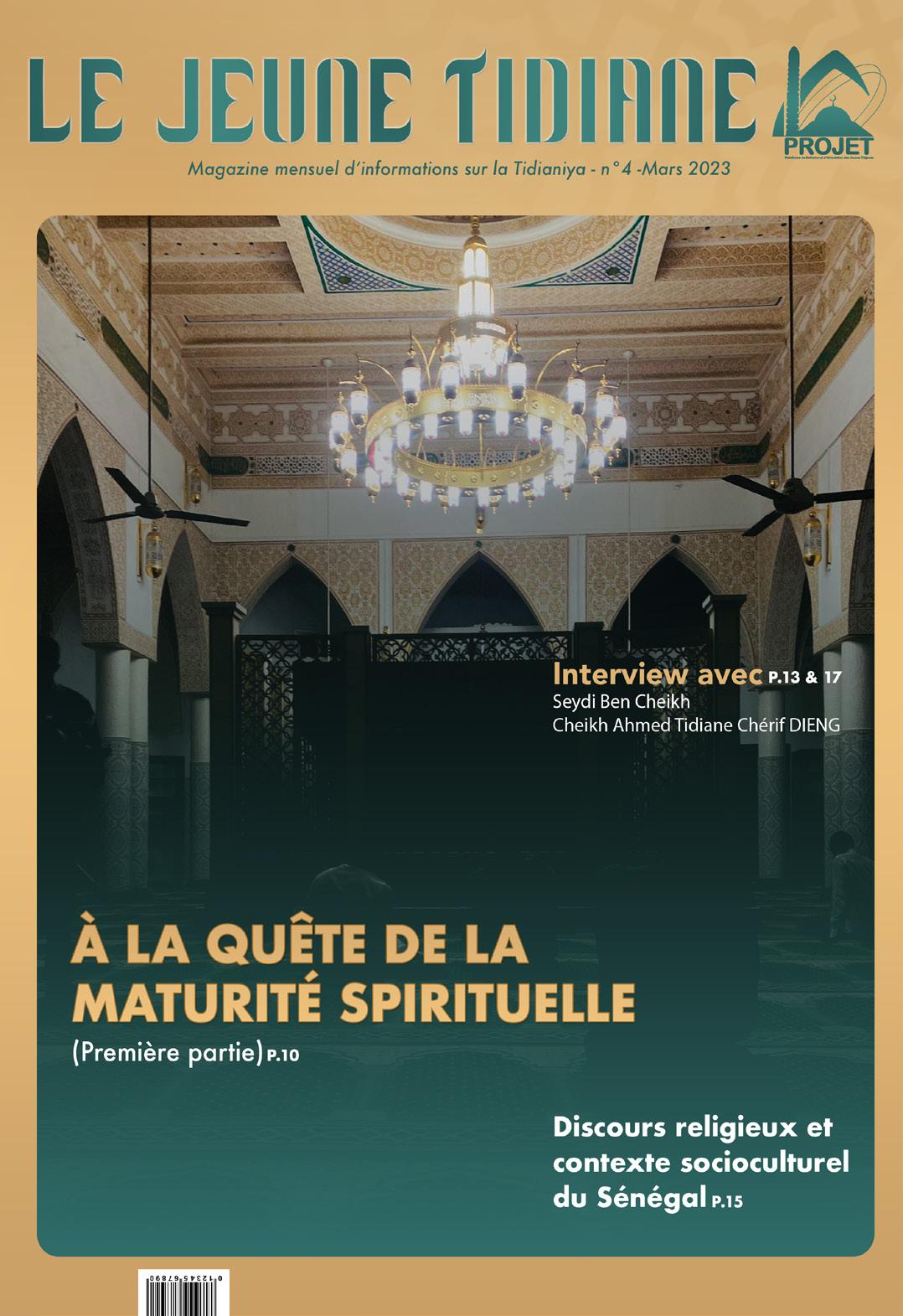 quille qui milite pour le rayonnement du legs de Maodo et de sa Hadara au pays de Marianne. Cette interview, riche en informations, nous apprend l’engagement de cet homme et de l’ensemble de ses condisciples. Avec Fatima Ngom, il est revenu sur sa formation et sa noble mission. Le deuxième est votre humble serviteur, moi-même, surpris d’ailleurs par un tel exercice difficile et périlleux. En effet, à partir de ce numéro, le magazine vous présentera l’ensemble des personnes qui, dans l’ombre, font tourner ce cadre où l’humain se forme et se transforme : PROJET. Au cours de cette interview, j’ai essayé tant bien que mal de rappeler la quintessence de cette responsabilité que mes condisciples m’ont confié et que j’exerce humblement et pleinement avec eux. Enfin, le cœur et le verbe ont aussi clôt ce magazine. Entre le grand amour de Serigne Babacar Sy (RTA) pour Seydina Cheikh (RTA) et sa majestueuse plume, Dieynaba Kane, à travers une approche inégalée, nous immerge au cœur de « Heul min sabilin ». En décrivant brillamment cet amour sublime de Serigne Babacar Sy (RTA) pour Seydina Cheikh (RTA), elle nous rappelle aussi que « c’est sur la base de cet amour que les soufis ont frayé des chemins vers l’exaucement. Nous pouvons donc entendre, par-là, que l’amour se situe au cœur du cheminement du fidèle vers son Seigneur : il va à la rencontre d’Allah par amour et, bien évidemment, sous la guidance du prophète. Il est dès lors le déterminant de l’obéissance à Allah, puisqu’aimer Dieu, c’est se cramponner à sa droite voie tout en se détournant de ses interdits, sans être mu par la convoitise de la félicité, non plus par la crainte de sombrer dans les gouffres de l’enfer ». Chers fidèles lecteurs du Magazine le Jeune Tidiane, de par le verbe, nous vous ferons lire et, de par vos cœurs, nous vous ferons sentir. Lire et sentir, dire et ressentir afin que nos plumes puissent laisser dans vos cœurs l’empreinte de la beauté de notre voie. Bonne lecture !