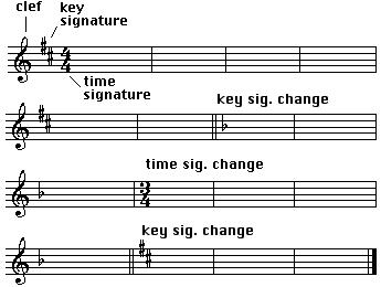 Threenotationelementsappearinthefirstlineofeverypiecemusic:theclef,thekeysignature, and the time signature. The clef and key signature appear at the beginning of every line of music. The time signature appears only on the first line and is not written again until it is changed
