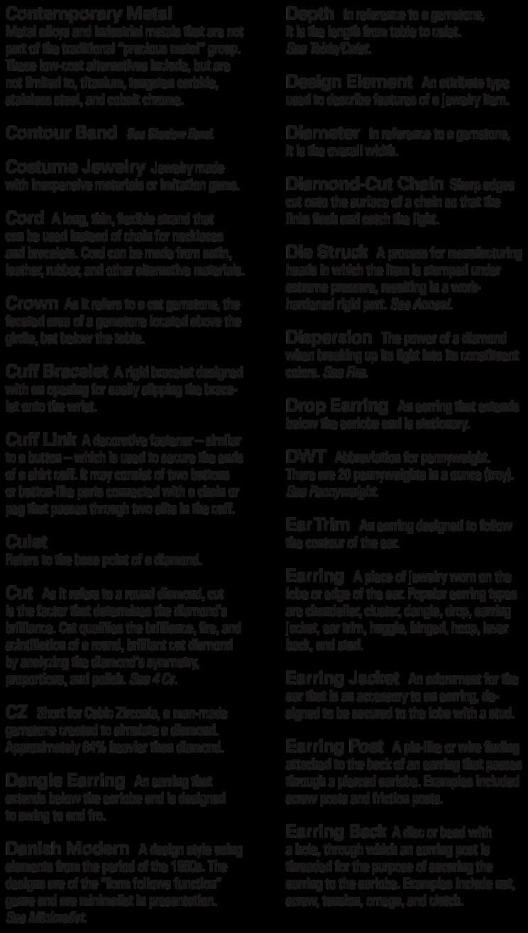 In the first section we will review the following sections: Metals, Diamonds and Gemstones. The second section will review: types of settings, types of engagement rings, types of chains and other jewellery design elements.