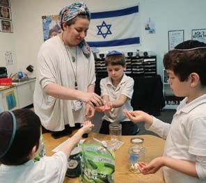 Jewish Studies Teacher (and mother of three HBHA students) Tammy Sandler teaches first-grade students about one of the laws of Shabbat with a hands-on activity.