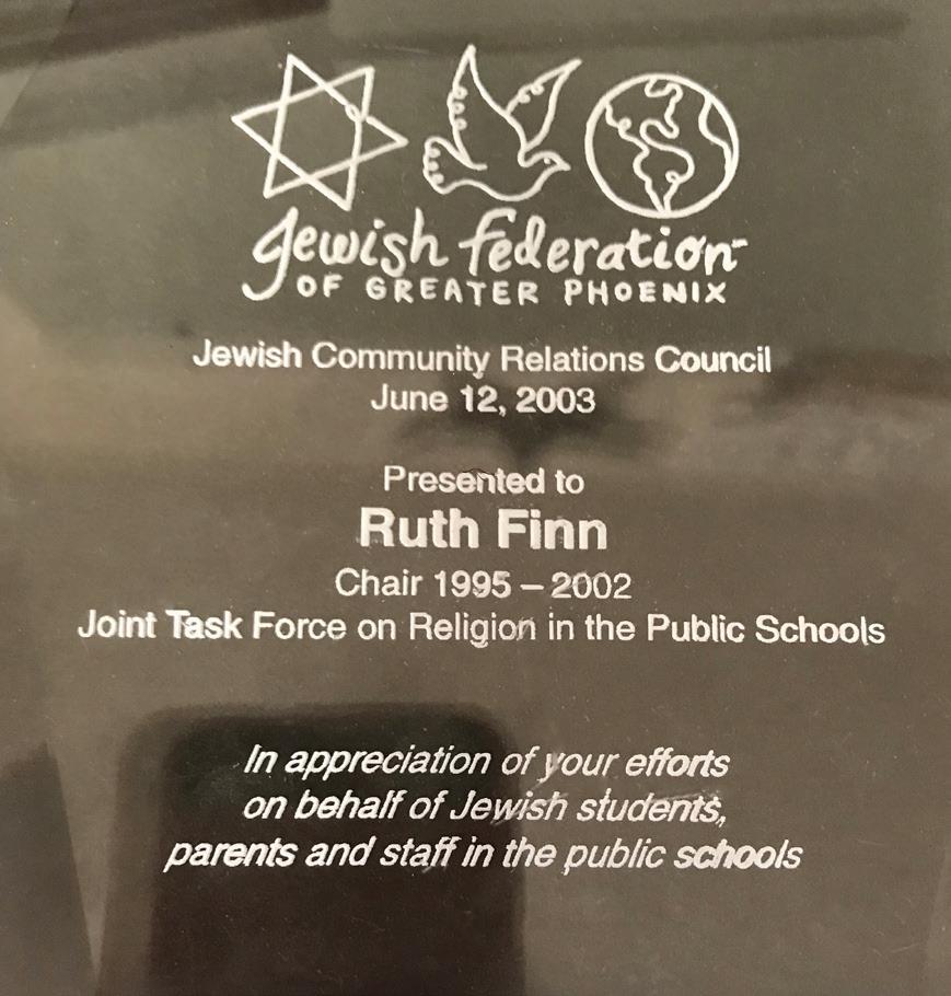 Born in New York City, she had to fight for her own education. With her husband, Herbert Finn, she moved to Phoenix in 1948 where they became champions of civil rights, fighting against segregated schools and discriminatory businesses. They were founding or active members of ADL, Civic Unity, AAUW and many other civil rights and Jewish organizations. Ruth and Herb passionately loved, worked and fought for justice together.