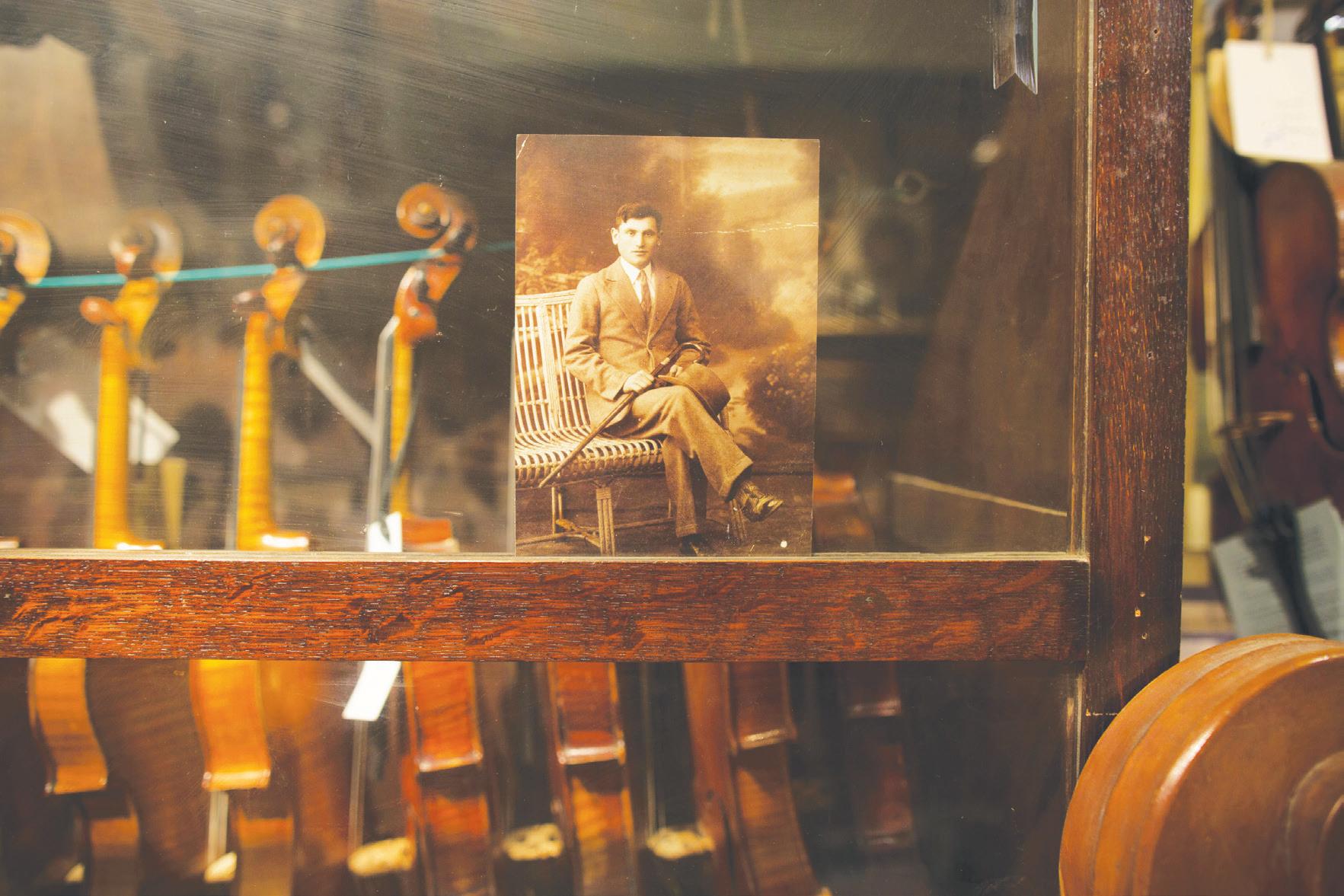 A picture of Amon Weinstein’s father-in-law, Asael Bielski, sits on a case that holds many of the violins the Weinstein family has restored.