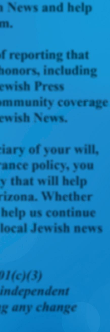By making the Jewish News a beneficiary of your will, trust, retirement account or life insurance policy, you will be creating a philanthropic legacy that will help sustain the vibrant voice of Jewish Arizona. Whether you read us in print or online, please help us continue our commitment to bringing you the local Jewish news our community counts on.