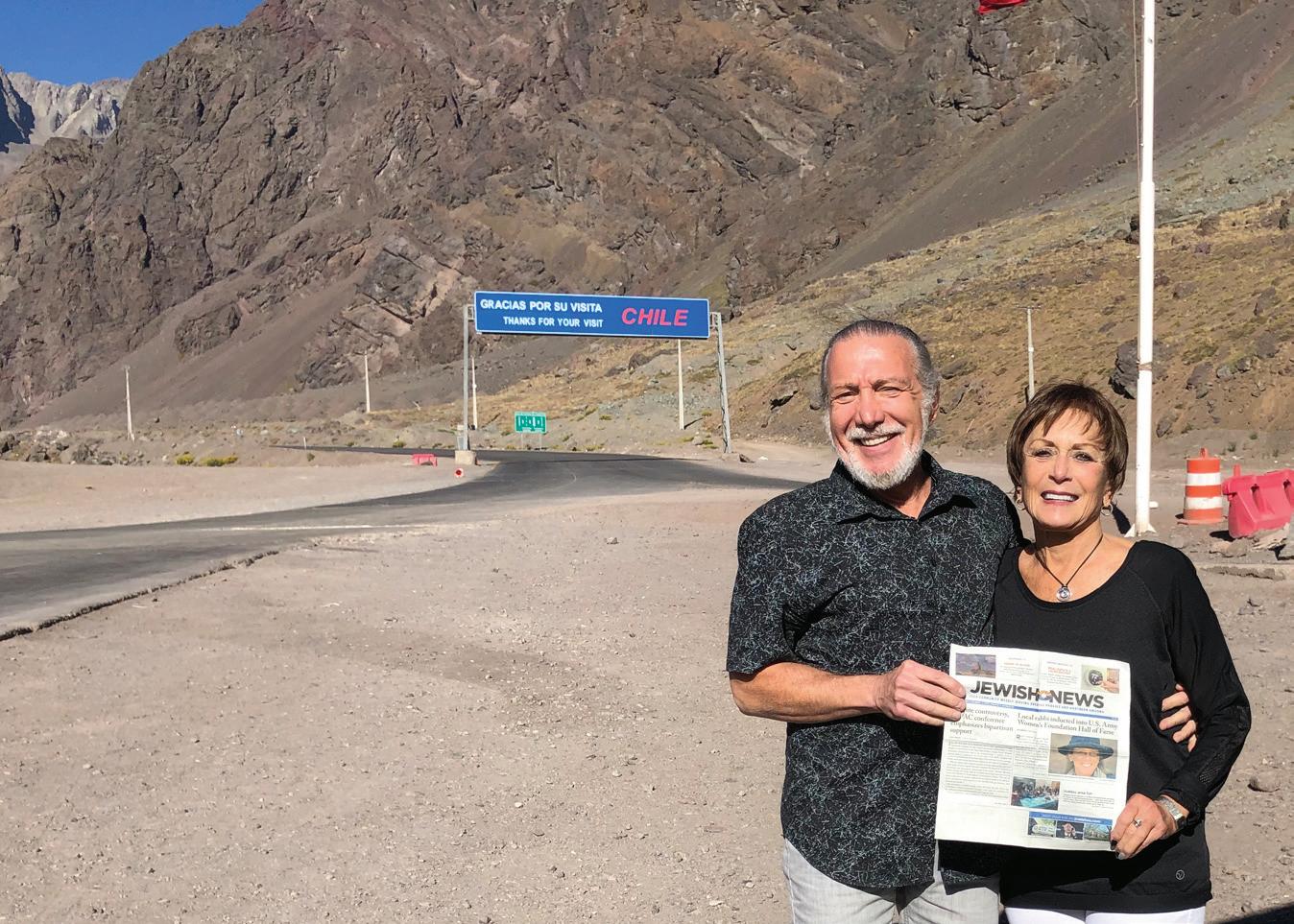 Cantor Baruch Koritan, left, and Dr. Joyce Durbin-Gold, right, of Temple Beth Shalom, Sun Cities, hold a copy of the Jewish News at the Argentina-Chile border on Tuesday, April 9. The border is approximately 11,500 feet above sea level.