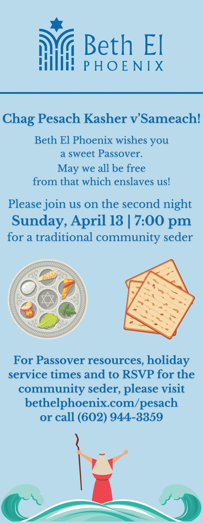 Women’s Passover Seder at Temple Beth Shalom: 12 p.m. Temple Beth Shalom, 12202 N. 101st Ave., Sun City. Join the Sisterhood of Temple Beth Shalom for the Barbara Moss Community Women’s Seder. Cost: $20 per person; reservations and payment required by April 3. For more information, call 623-977-3240.