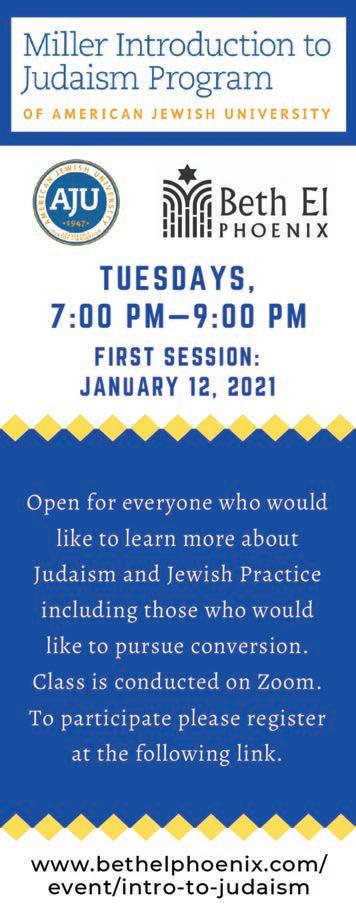 Wise Aging: 11:30 a.m.-1 p.m. A Bureau of Jewish Education course taught by Nan Pollinger. Wise Aging is designed specifically to meet the social, emotional and spiritual needs of Jewish seekers entering second adulthood. Explore the tools and resources to age wisely through the lens of Jewish wisdom. Learn positive ways to navigate a meaningful transition to the next chapter on life’s journey. Cost: $130. For more information or to register, visit bjephoenix.org/courses/ available-courses.