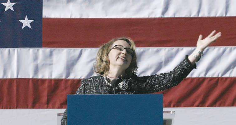 Gabby Giffords giving a speech in an archival scene from “Gabby Giffords Won’t Back Down." COURTESY OF BRIARCLIFF ENTERTAINMENT