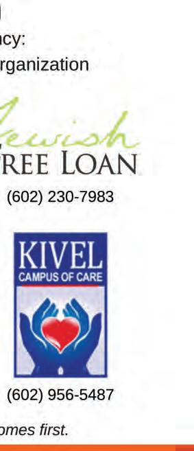 JACS — A Jewish Recovery Group 47 J BNAZ 55 Jew PHX 50 Jewish Association of Singles Services (J.A.S.S.) 29 Jewish Community Center of the NW Valley 49 Jewish Community Center / Valley of the Sun 22 Jewish Community Foundation of Greater Phoenix 22 Jewish Community Foundation of Greater Prescott, Inc. 23 Jewish Community Foundation Youth Philanthropy Board 41 Jewish Community Relations Council (JCRC) 27 Jewish Family & Children’s Service (JFCS).............................11, 39, 47 Jewish Federation of Greater Phoenix 22, 55 Jewish Federation Senior Rides Program... 64 Jewish-Founded Fraternities and Sororities at ASU 38 Jewish Free Loan................................. 11, 23 Jewish Labor Committee 28 Jewish Learning Center 32 Jewish Legal Aid 55 Jewish Life & Learning @ the EVJCC 32 Jewish National Fund 29, 44 Jewish National Fund on Campus ............. 32 Jewish National Fund Travel & Tours 45 Jewish News 49 Jewish News 6 Jewish Recovery Fellowship of Arizona 47 Jewish Social Connection 25 Jewish Social Group of Cave Creek and Carefree 25 Jewish Student Union 41 Jewish Studies 31 Jewish Tuition Organization (JTO) 11, 39 Jewish War Veterans 25 Jewish Women’s Circle, Scottsdale ............ 25 JFCS Center for Senior Enrichment at The Palazzo 64 JFCS Older Adult Services 64 JNFUTURE 29 Joint Action Committee for Political Affairs (JAC) 28 K Kehillas | Yeshivas HaTurim 17 K eilim Mikvah (for utensils) 13 K ierman Law, PLC 55 Kitchen 18 (Chabad) 54 Kivel Campus of Care 11, 66 Kumon of Scottsdale — Shea 33, 39 L La Siena – An SRG Senior Living Community 66 Law Office of Hope E. Fruchtman 55 Lev Chadash: Jewish Southwest Encounters 32 L evi Catering LLC 51 Limmud AZ 32 Linda M. Cucher, MACP, LPC ................ 47 M Madison School District............................ 35 Mad Science of NE Phoenix 32 MAIN LIBRARIES 9 Makor 18 Manhattan Pizza & Subs (Chabad) 54 Maravilla Scottsdale 67 Marcie and Rob Realtors 67 MESA 6, 8 Michael B. Lebowitz, DDS 47 Mikvah Chaya Mushka .............................. 13 M inkoff Center for Jewish Genetics 23, 47 Mitzvah Matchmaker 29 Moishe House 29 MOT2 55 Mt. Sinai Cemetery 14 N NA’AMAT USA 25 National Council of Synagogue Youth 41 NCSY/Junior NCSY 41 Nefesh (Congregation Beth Tefillah) 37 New Way Academy .................................... 35 New York Bagels ’N Bialys (Vaad) 53 NFTY 41 N ikki Bernstein 56, 57 NowGen Phoenix 29