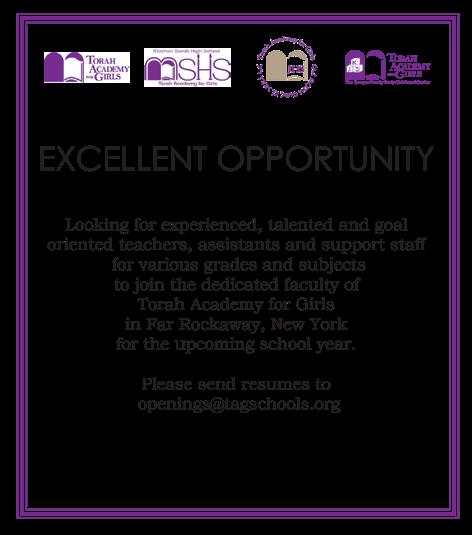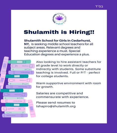 A YESHIVA IN QUEENS is looking for an experienced part/ full time secretary, 2-year-old morah, kindergarten morah, kindergarten morah assistant and Pre-1A English teacher for the 2022-2023 school year. Nice and timely pay. Please email resume to mshelt613@gmail.com or call/text 718-971-9799.