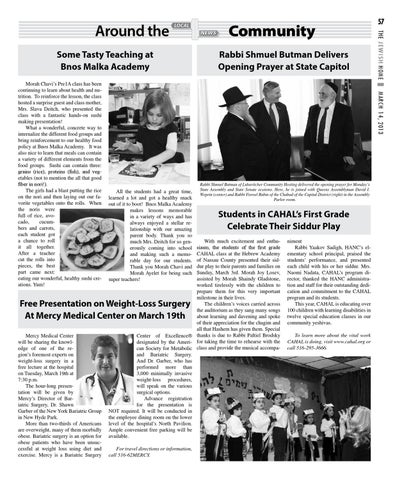 With much excitement and enthusiasm, the students of the first grade CAHAL class at the Hebrew Academy of Nassau County presented their siddur play to their parents and families on Sunday, March 3rd. Morah Joy Losev, assisted by Morah Shaindy Gladstone, worked tirelessly with the children to prepare them for this very important milestone in their lives. The children’s voices carried across the auditorium as they sang many songs about learning and davening and spoke of their appreciation for the chagim and all that Hashem has given them. Special Center of Excellence® thanks is due to Rabbi Paltiel Brodsky designated by the Ameri- for taking the time to rehearse with the can Society for Metabolic class and provide the musical accompaand Bariatric Surgery. And Dr. Garber, who has performed more than 3,000 minimally invasive weight-loss procedures, will speak on the various surgical options. Advance registration for the presentation is NOT required. It will be conducted in the employee dining room on the lower level of the hospital’s North Pavilion. Ample convenient free parking will be available.