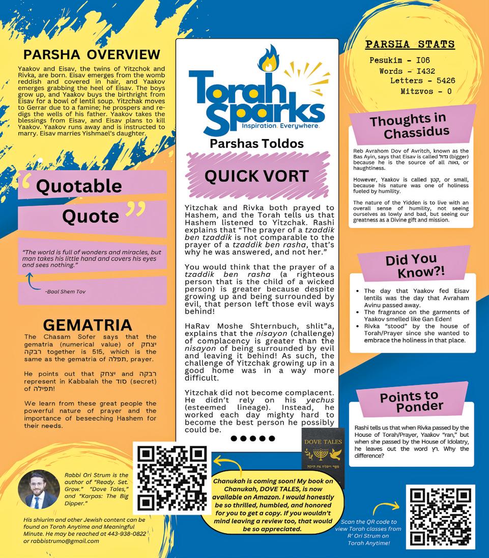 Perhaps, this is why this parsha is called Toldos. The message is that if you want successful children, the greatest feat possible, then recognize their individual uniqueness and make sure to enthusiastically support them in that area.