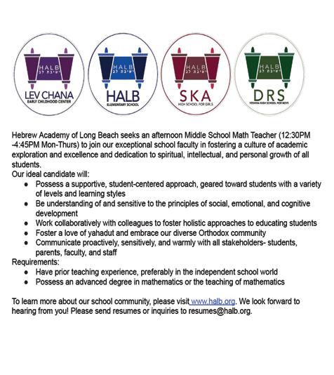 In Great Neck, NY, is seeking general studies teachers for both the elementary and middle schools, for the upcoming academic year. Mon-Thur afternoons. Competitive salary, warm and supportive environment. Send resume to m.kalati@kolyaakov.org