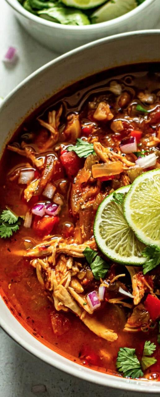 Add the chicken breast, canned tomatoes, canned green chilies, spices, lime juice, and chicken broth to the pot. Stir until well combined. Bring the soup to a rolling boil and then reduce the heat to a simmer. Allow the soup to simmer for 30 minutes or until the chicken is tender and easy to shred. Transfer the chicken breast from the soup to a small bowl. Use two forks to shred the meat. Add the chicken back to the soup and stir until well combined. Serve the soup with fresh cilantro, diced red onion, and fresh lime wedges. Enjoy!