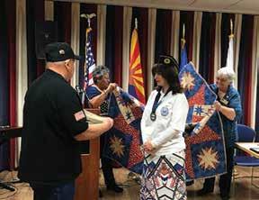 PARTY AT THE POST - On Dec. 17, Scottsdale Post 210 of the Jewish War Veterans held a Chanukah party. Quilts of Valor members Bob Bernal, Rebecca Bernal and Cheryl Vorin presented Commander Rochel Hayman with a beautifully made quilt for her service during Operation Desert Storm. Entertainment was provided by choir members from Torah Day School in Phoenix, led by Rabbi Gedalia Goldstein.