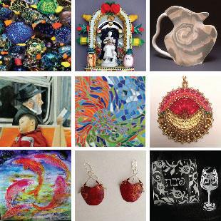Media includes collage, paint, silk, fused glass, fiber, precious metals, ceramics, beadwork and photography.