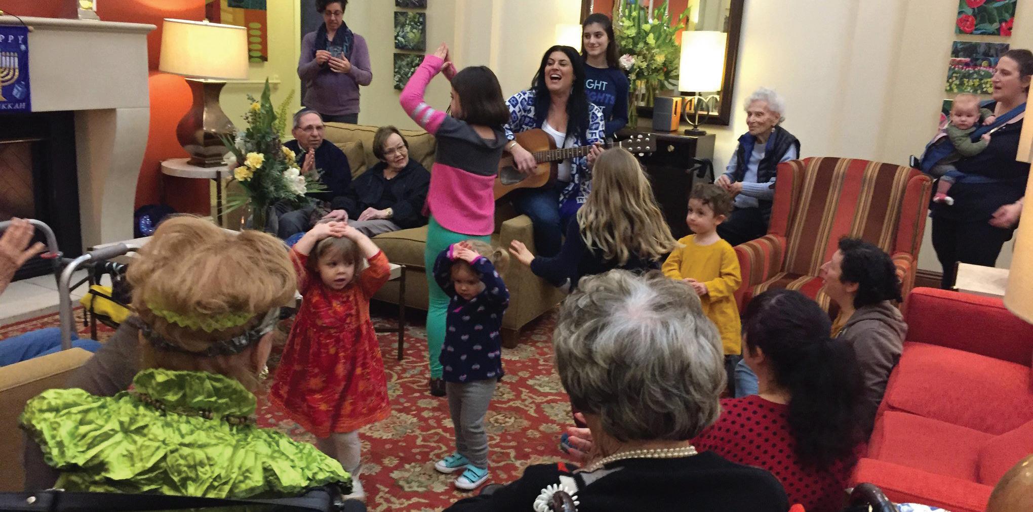 – Kimberly Schneiderman plays guitar while little ones entertain residents of Cedar Sinai Park on the second night of Hanukkah.