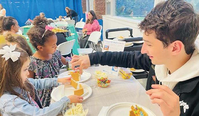 Volunteer Jake Balinksy helps children create edible sukkahs.