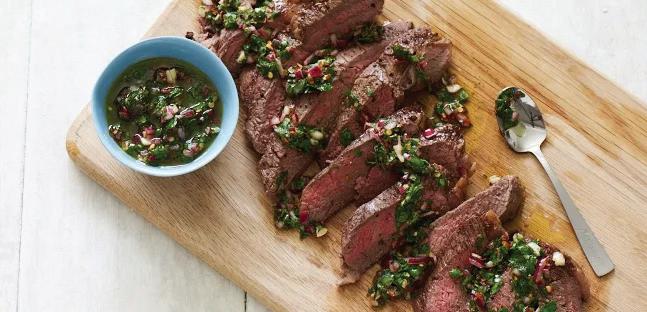 2. Grill steak over preheated grill on high heat for 8 to 10 minutes per side for medium rare and let rest 6 minutes before slicing. Cut into ¼-inch thick slices and drizzle liberally with chimichurri.