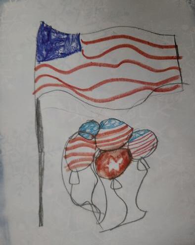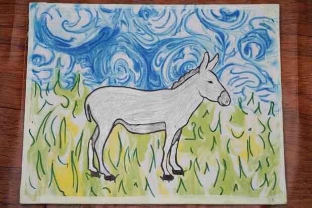 Color the donkey with a silver maker, then take a pencil and color over the nose, hair and tail. Using blue and green sharpies add details to the sky and grass.