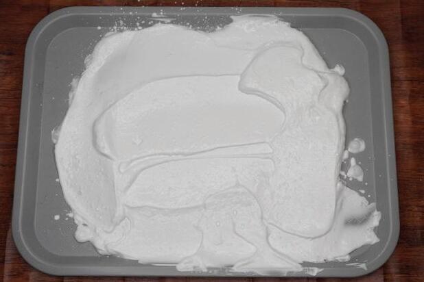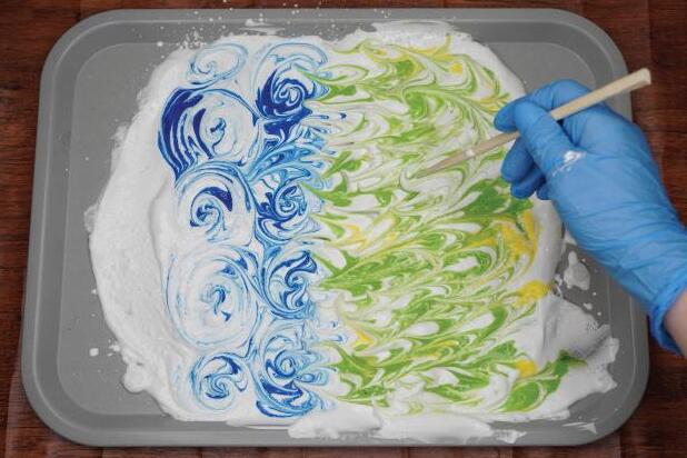 Take a big tray and fill its surface with a thick layer of shaving foam, then smooth it out.