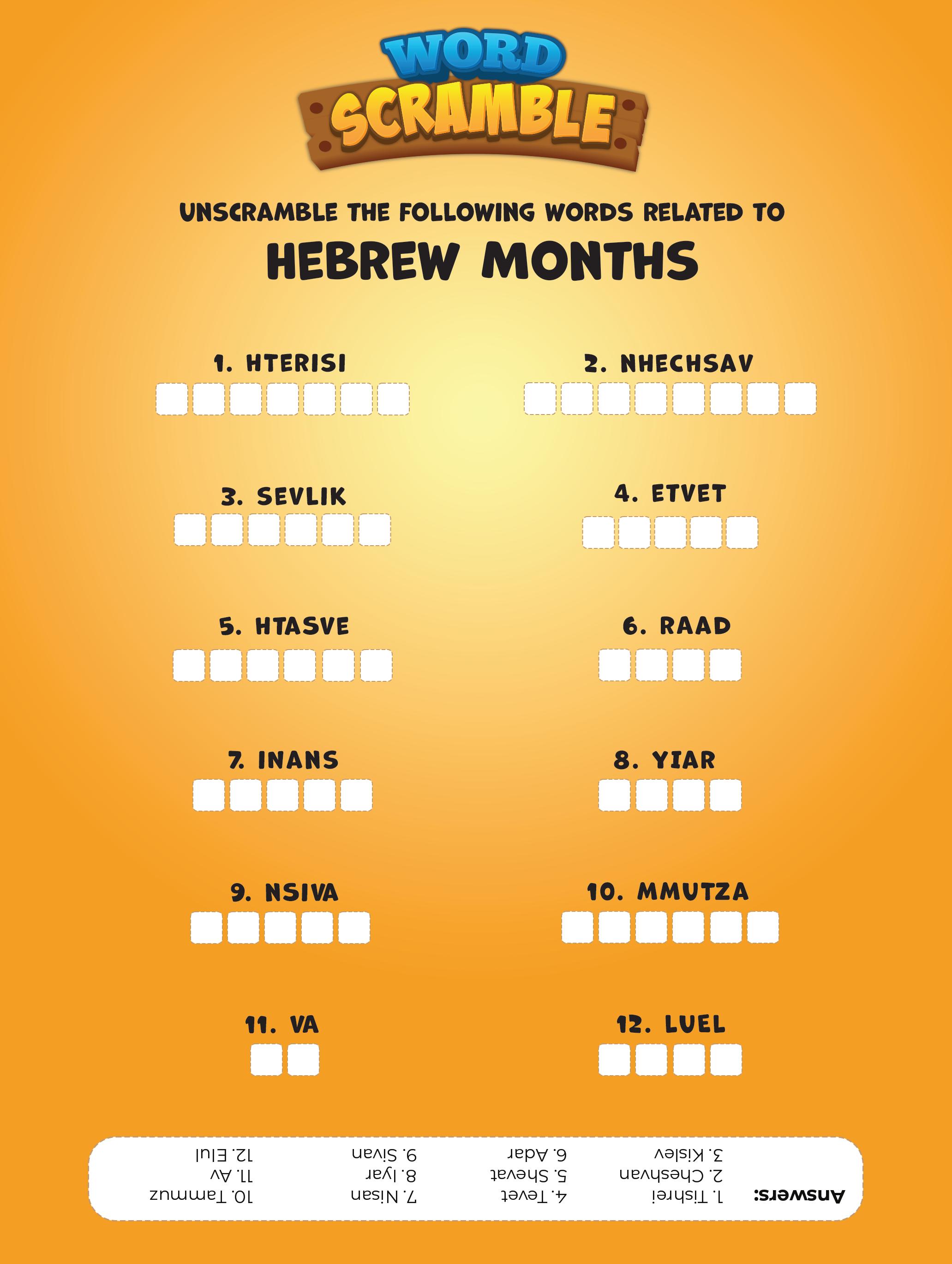 For each Hebrew month, find or draw a symbol that represents an important event or holiday in that month. For example: Tishrei: Shofar (Rosh Hashanah), Sukkah (Sukkot) | Cheshvan: Umbrella (start of the rainy season)