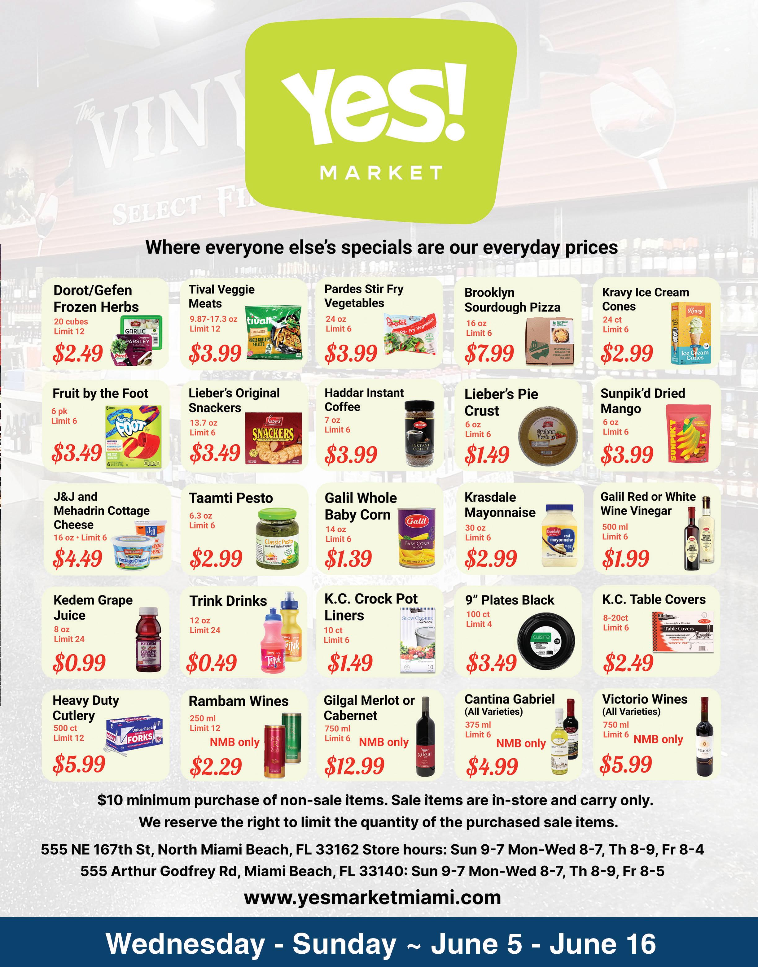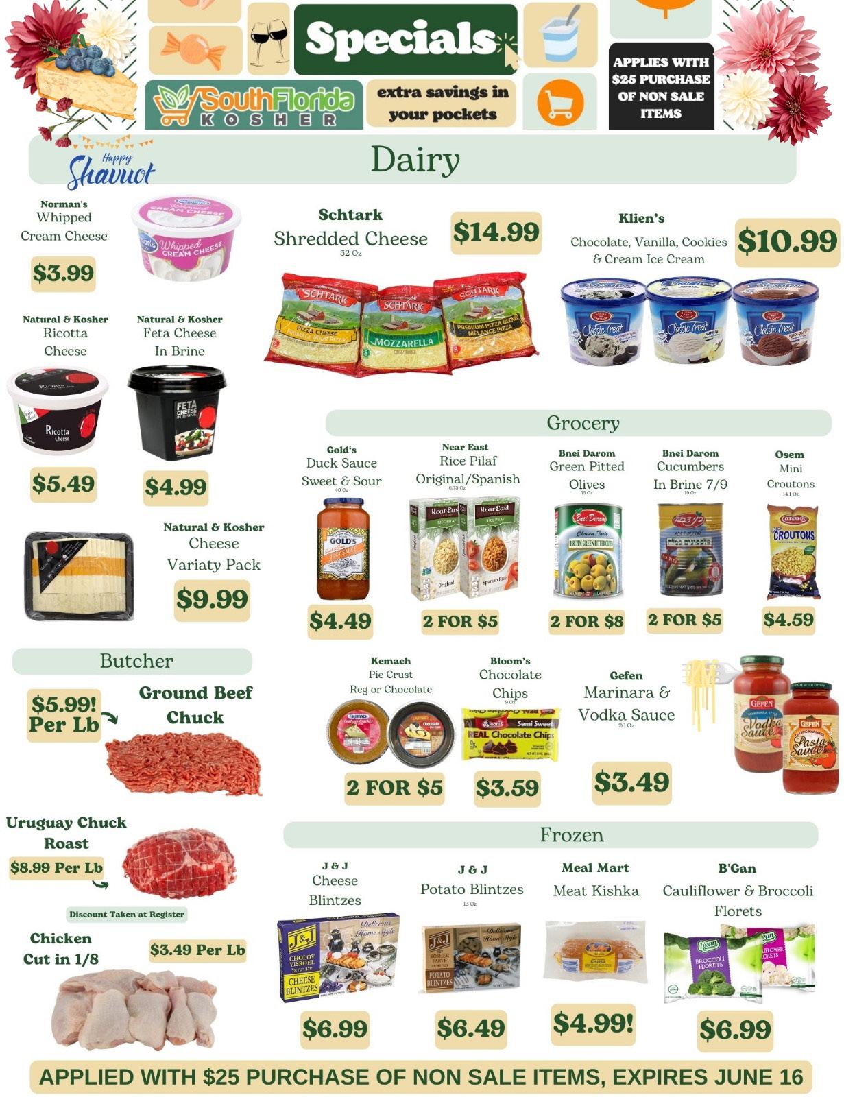 FLORIDA'S NEWEST KOSHER SUPERMARKET COME CHECK OUT 5651 CORAL RIDGE DRIVE, CORAL SPRINGS FL 33076 (RIGHT OFF EXIT 14 OF THE SAWGRASS) Store - 954-752-0008 Whatsapp - 954-706-8991 OPEN UNTIL 10 PM EVERY THURSDAY KEMACH GRAHAM PIE CRUST $3.49 $2.99 HURRY! SPECIALS ARE GOOD UNTIL JUNE 18th HOURS: SUNDAY 9 AM-7 PM MON-WED 8 AM-8 PM FRIDAY 8 AM-5 PM THURSDAY 8 AM-10 PM Specials GLICK'S APPLE JUICE 64 OZ $5.29 2 FOR $8.49 HADDAR MUSHROOMS 8 OZ $2.69 3 FOR $6.49 LIEBERS SNACKERS 13.7 OZ $6.99 $5.99 OSEM BAMBA 10 PACK $8.99 $7.49 MEHADRIN 2 LB GREEK YOGURTS $8.49 $6.99 J&J SOUR CREAM $7.49 $6.49 NORMAN'S 5 LB CREAM CHEESE TUB $33.99 $29.99 CHEF TZALI RAVIOLI VARIETIES $8.99 $7.49 MEHADRIN DAIRY ICE CREAM ½ GAL $12.99 $10.99 AMNON'S PIZZA $16.99 $13.99 DECOR CLASSIC WHITE/SILVER PLATES (COMBO PACK) $13.99 $9.99 DECOR EDGE WHITE/SILVER PLATES (COMBO PACK) $13.99 $10.99 NER BEESWAX YAHRZEIT CANDLES $3.79 $2.99 SHAVOUS HOURS SUN, JUNE 9 8 AM - 9 PM MON, JUNE 10 8 AM - 10 PM TUE, JUNE 11 8 AM - 5 PM